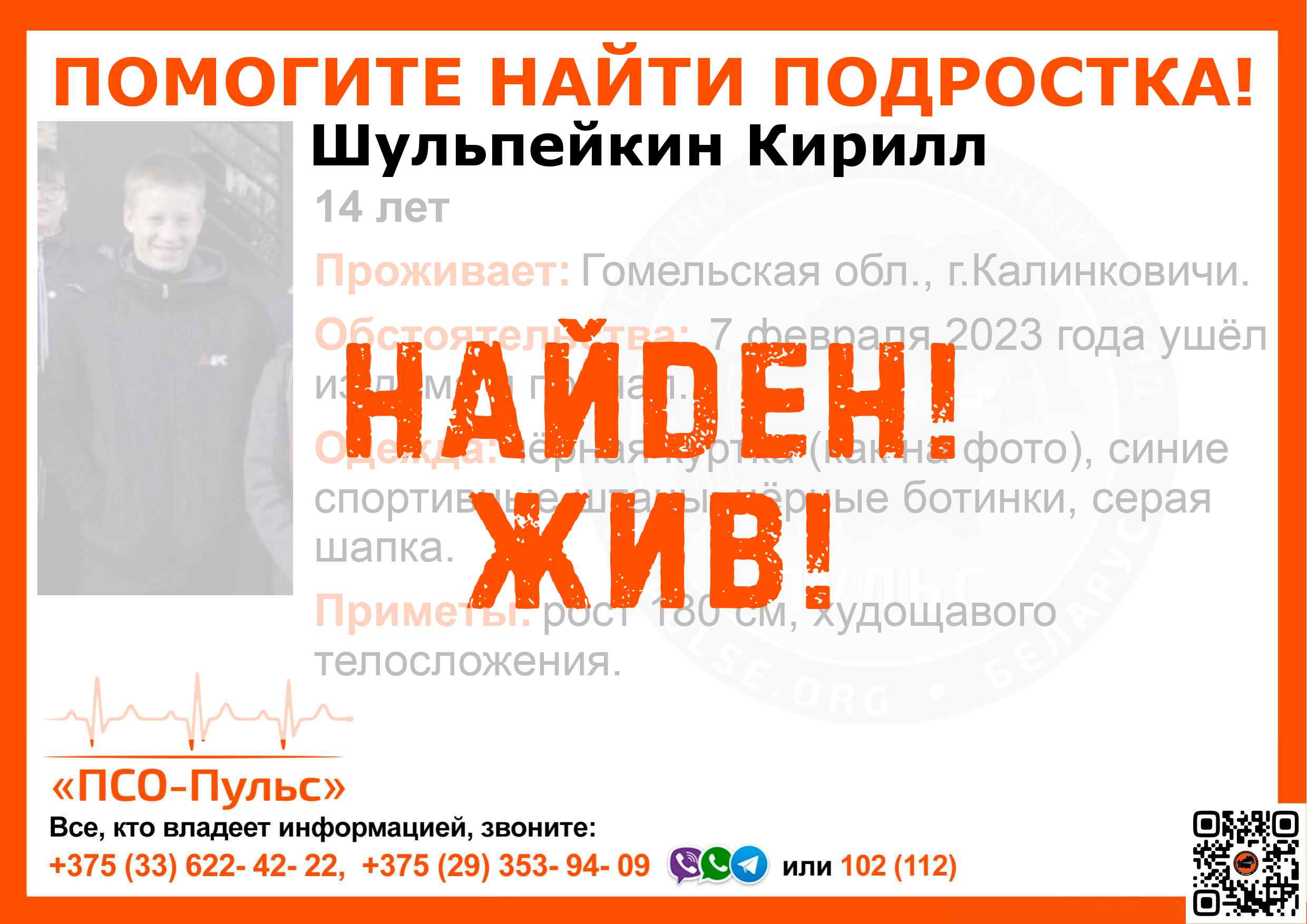 Всех, кто владеет информацией, просим сообщить: ПСО "ПСО-Пульс" +375(33)622-4222 |