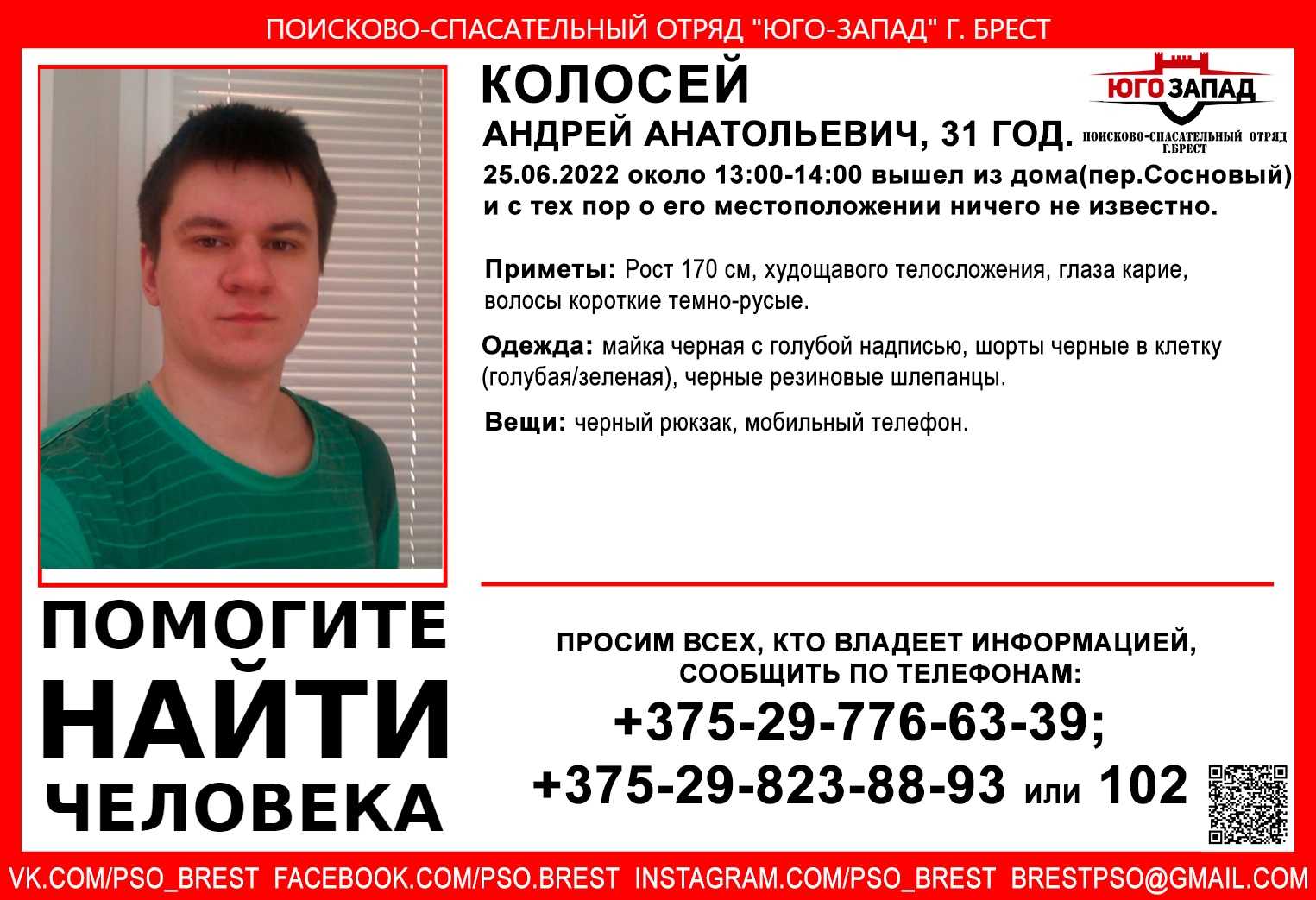 Всех, кто владеет информацией, просим сообщить: ПСО "Юго-Запад" +375(29)7766-339 |