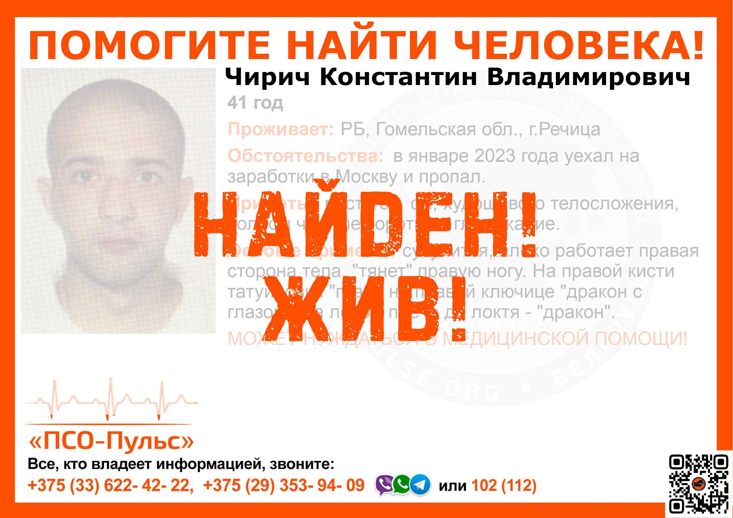 Всех, кто владеет информацией, просим сообщить: ПСО "ПСО-Пульс" +375(33)622-4222 |