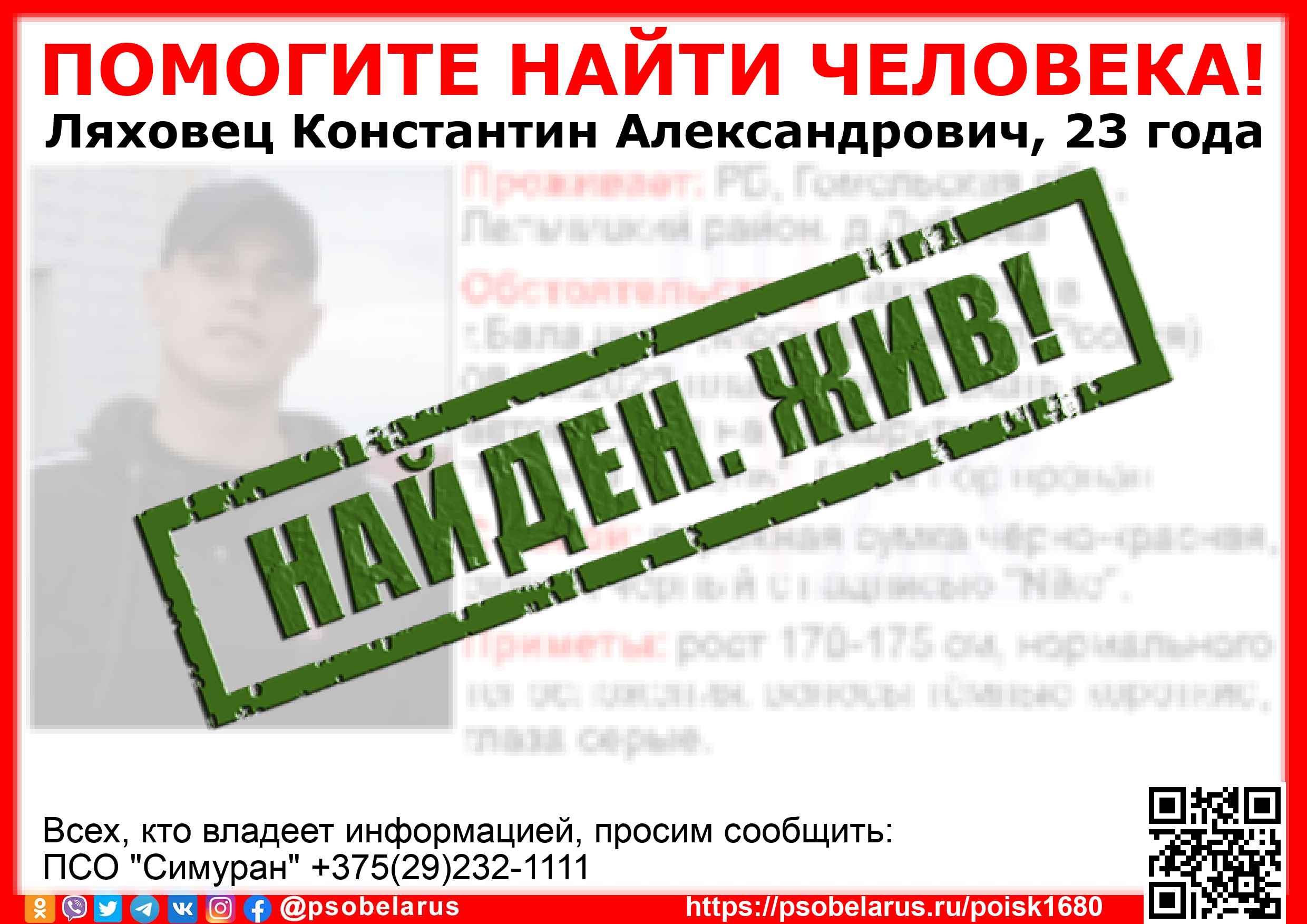 Всех, кто владеет информацией, просим сообщить: ПСО "Симуран" +375(29)232-1111 |