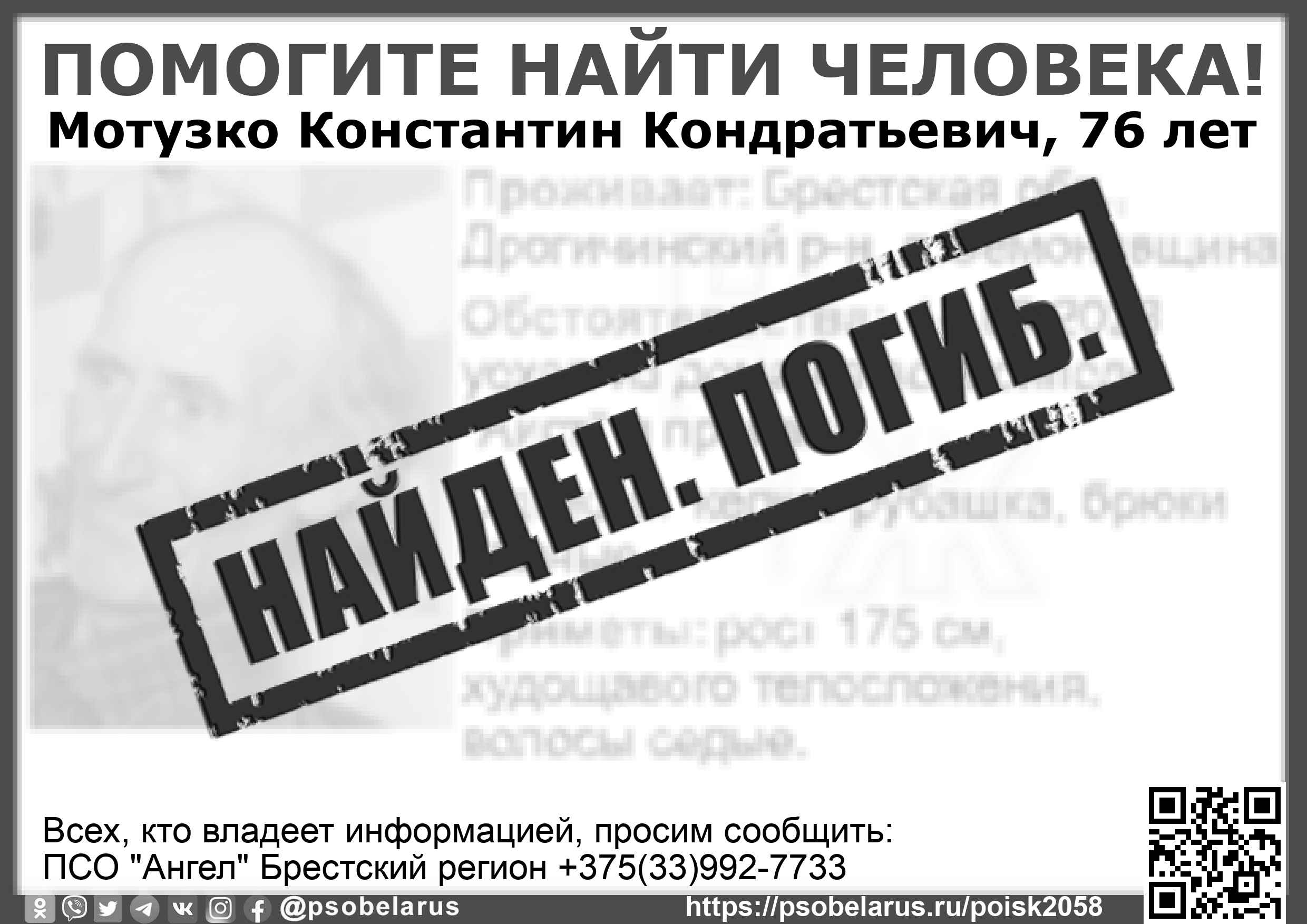 Всех, кто владеет информацией, просим сообщить: ПСО "Ангел" Брестский регион +375(33)992-7733 |