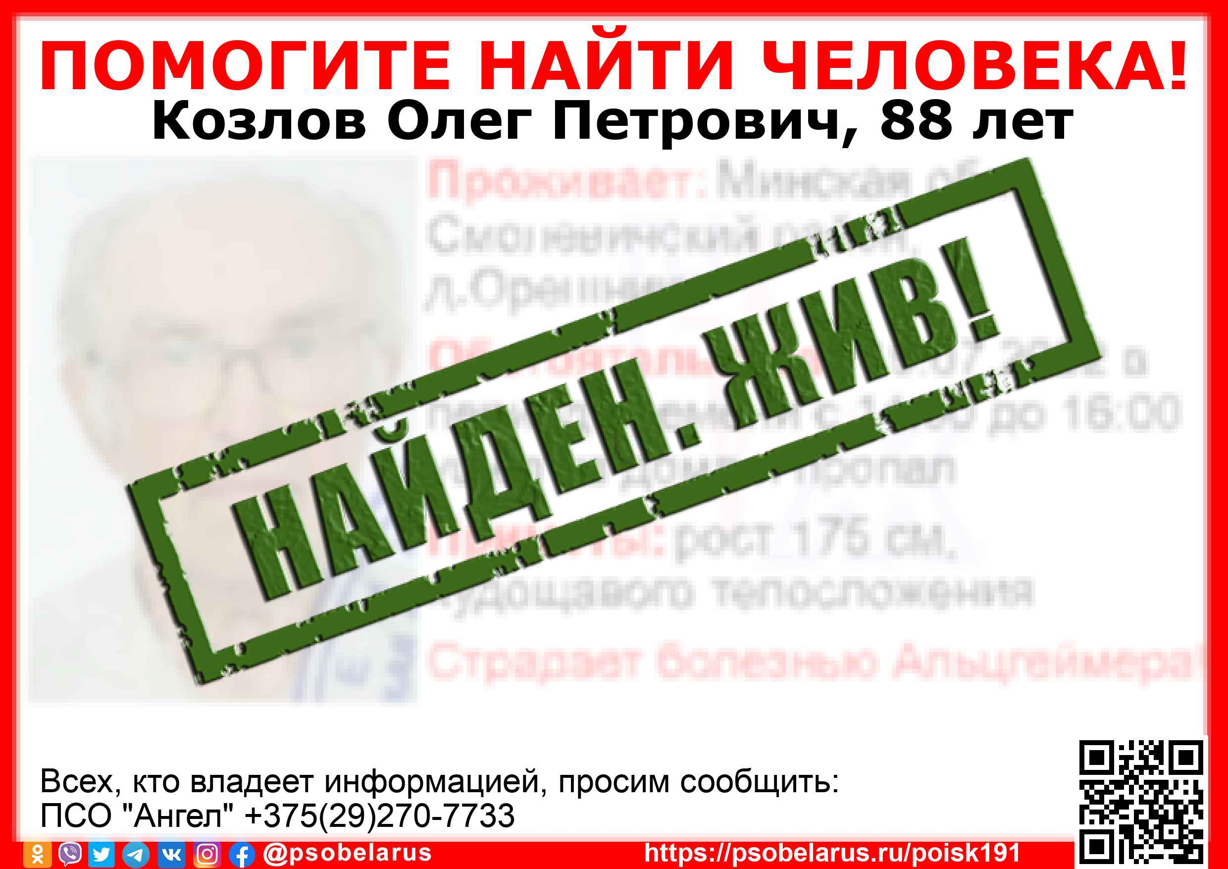 Всех, кто владеет информацией, просим сообщить: ПСО "Ангел" +375(29)270-7733 |