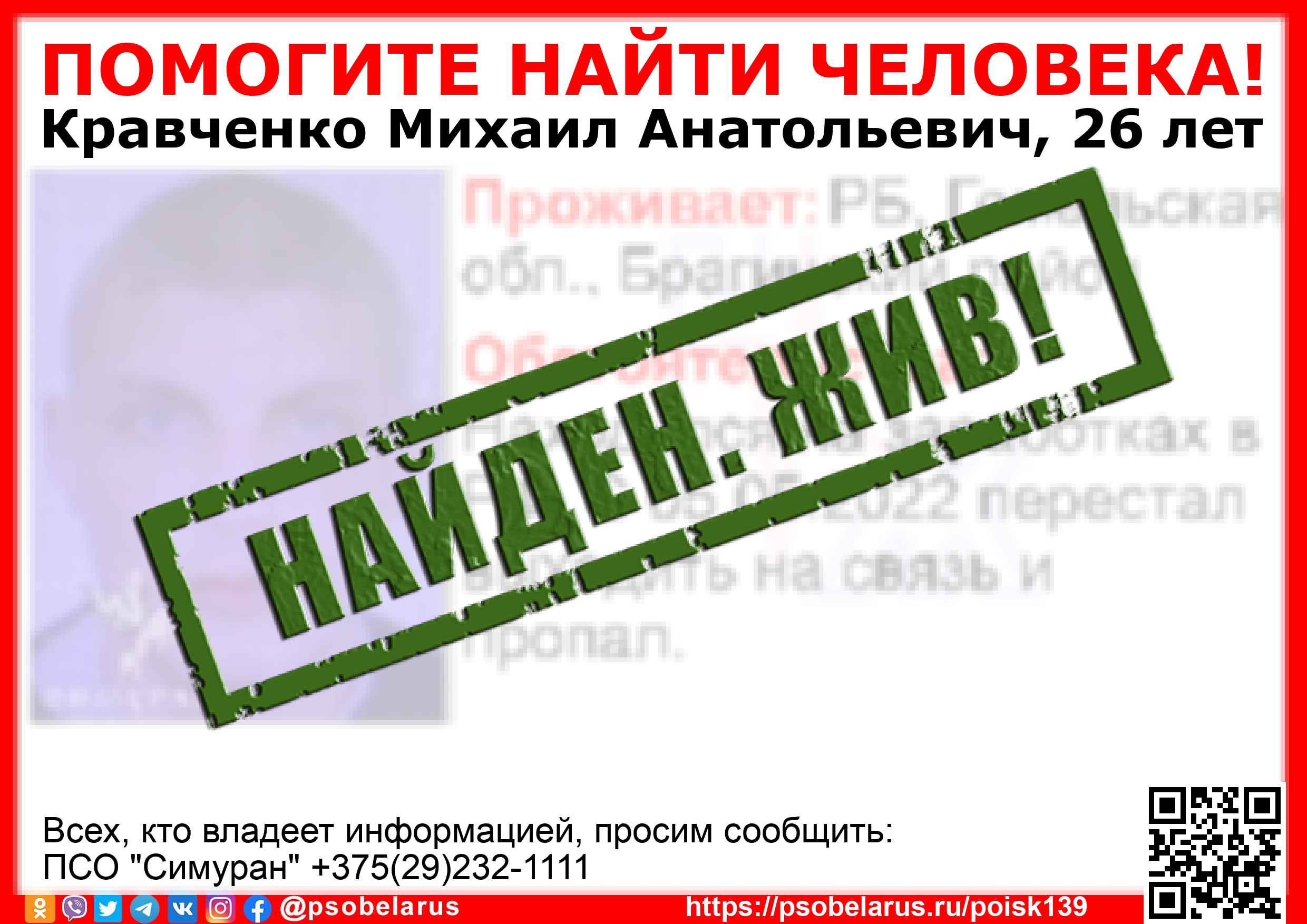 Всех, кто владеет информацией, просим сообщить: ПСО "Симуран" +375(29)232-1111 |