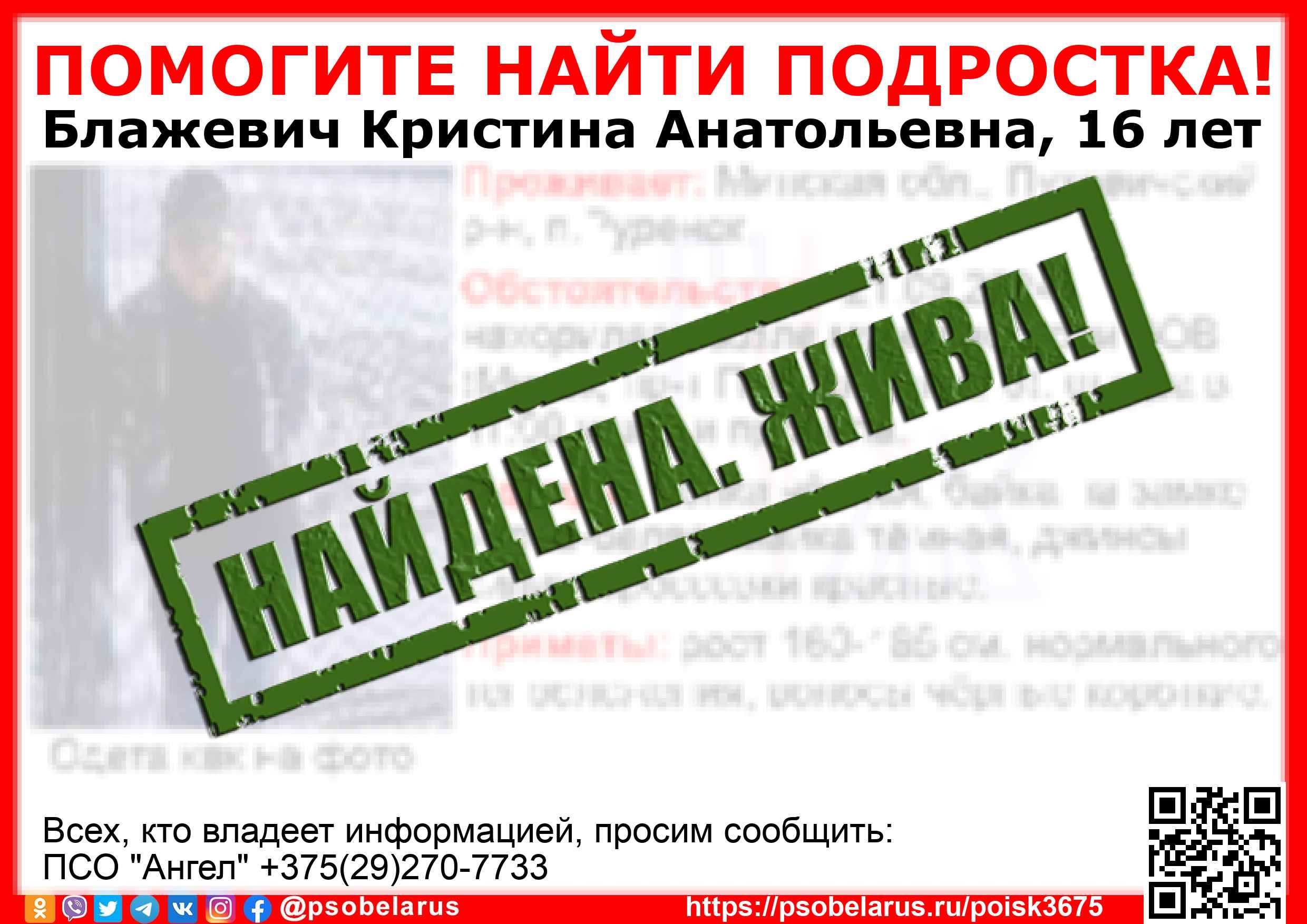 Всех, кто владеет информацией, просим сообщить: ПСО "Ангел" +375(29)270-7733 |