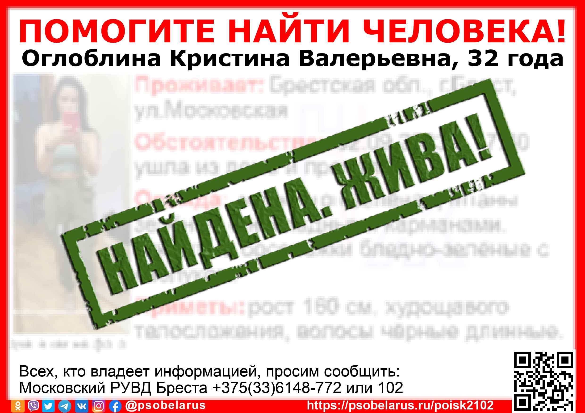Скачать ориентировкуДля оперативного получения информации о пропавших людях и сборах на поиски можно подписаться на бота оповещения: Телеграм