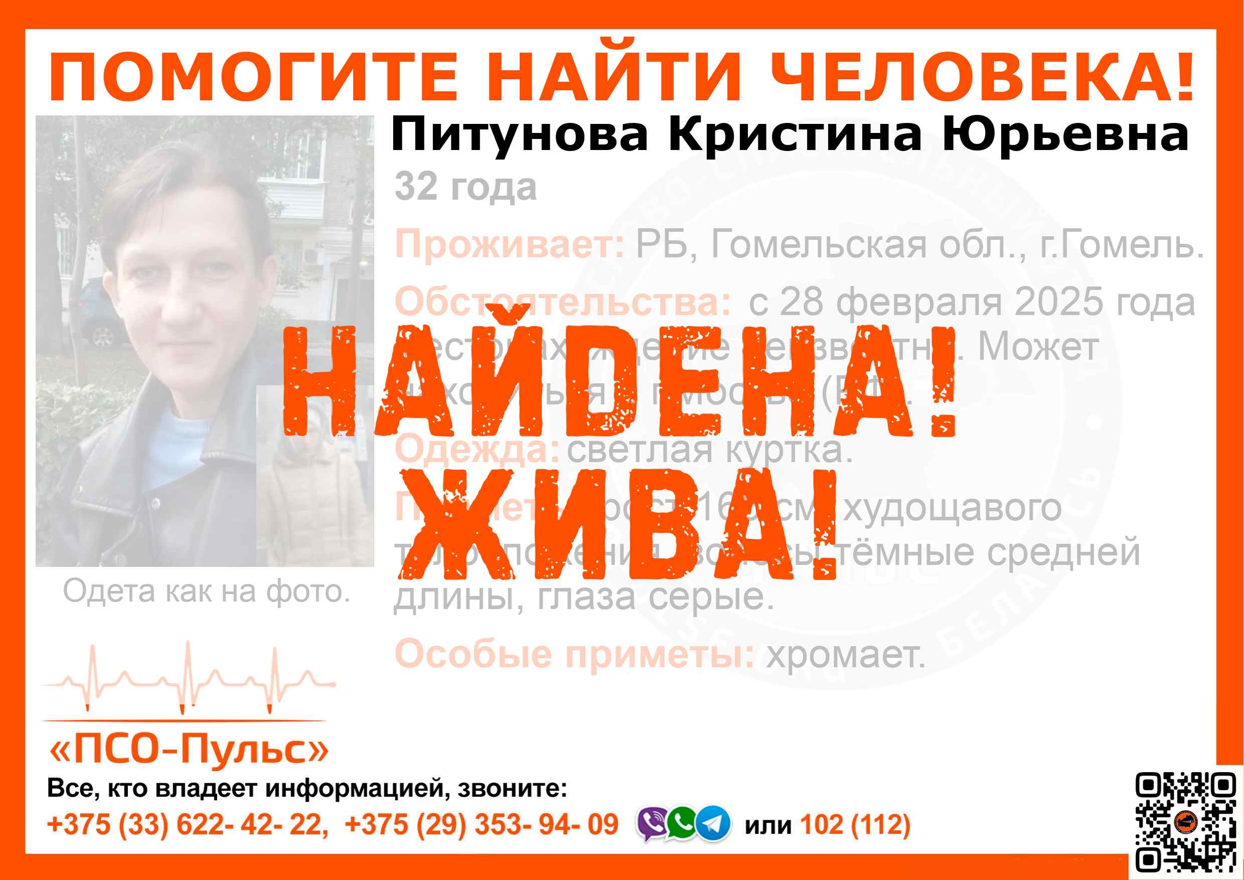 Всех, кто владеет информацией, просим сообщить: ПСО "ПСО-Пульс" +375(33)622-4222 |