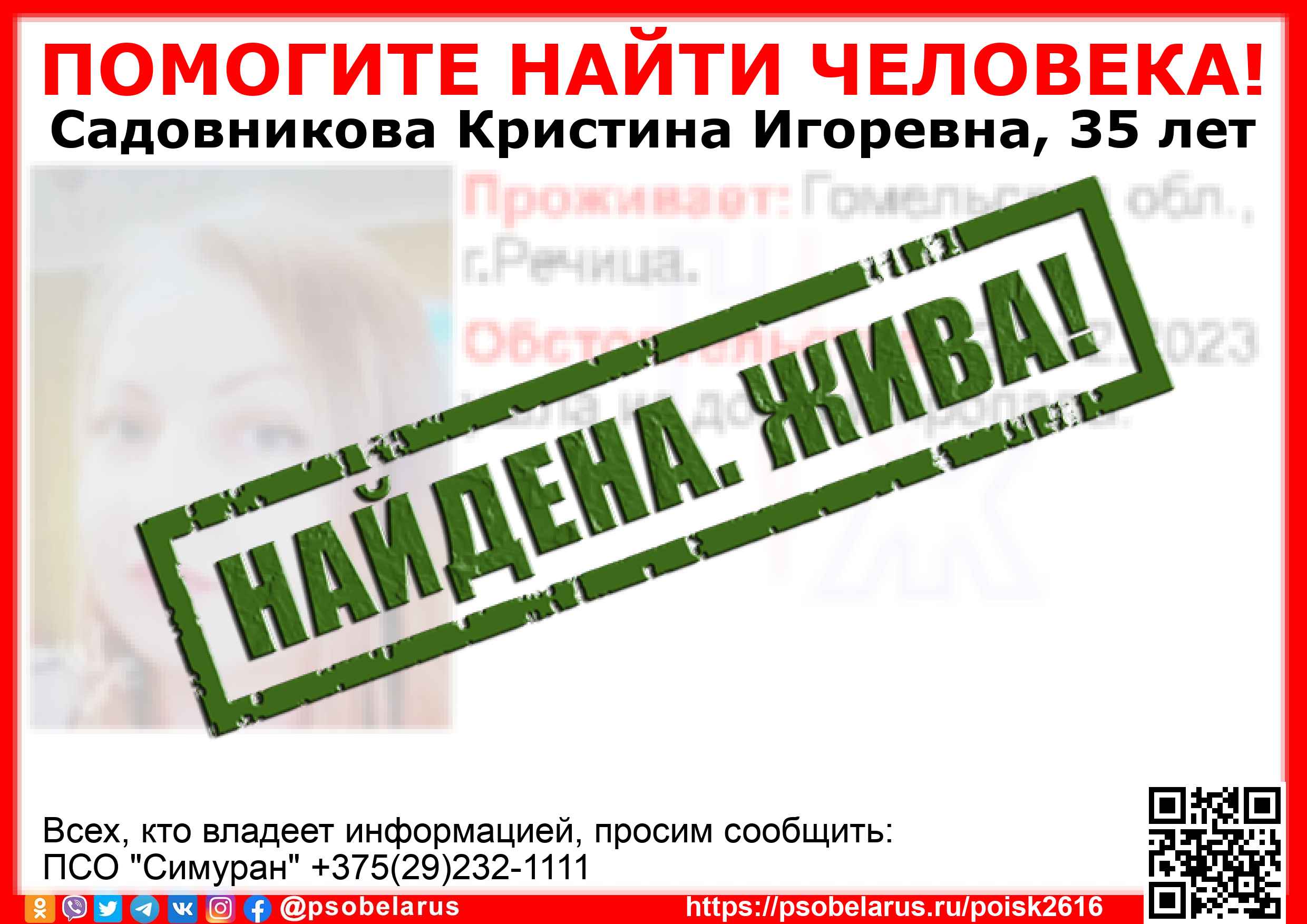 Всех, кто владеет информацией, просим сообщить: ПСО "Симуран" +375(29)232-1111 |