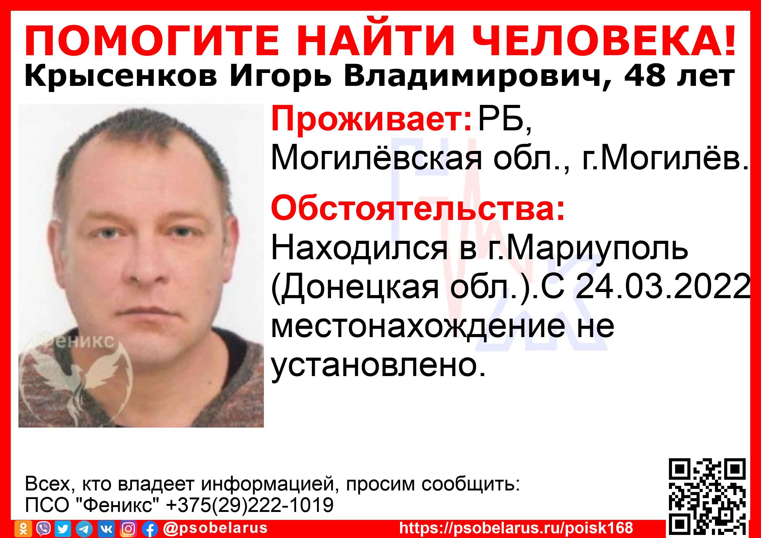 Всех, кто владеет информацией, просим сообщить: ПСО "Феникс" +375(29)222-1019 |