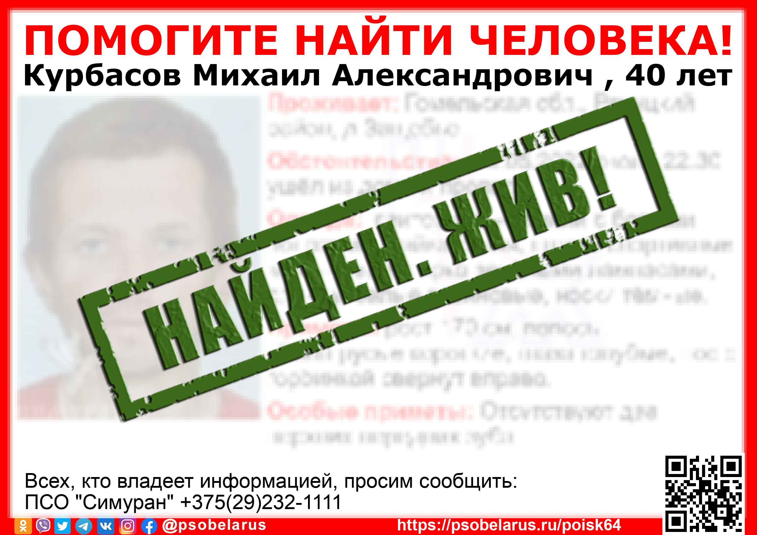 Всех, кто владеет информацией, просим сообщить: ПСО "Симуран" +375(29)232-1111 |