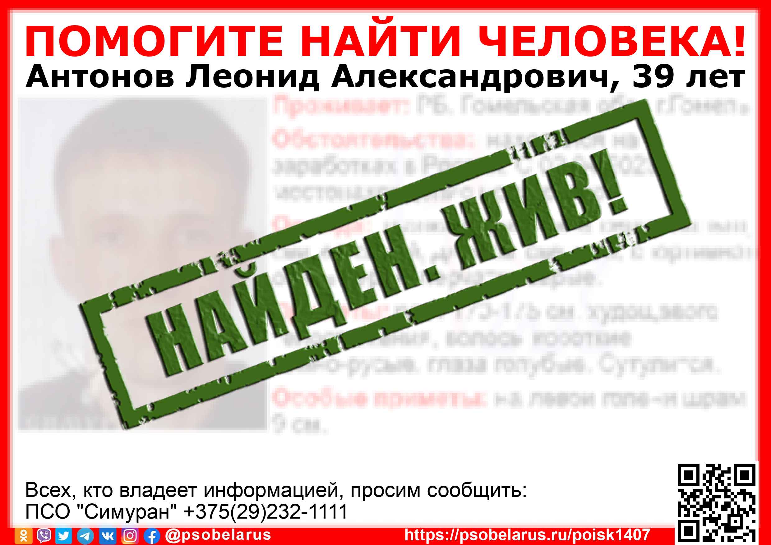 Всех, кто владеет информацией, просим сообщить: ПСО "Симуран" +375(29)232-1111 |