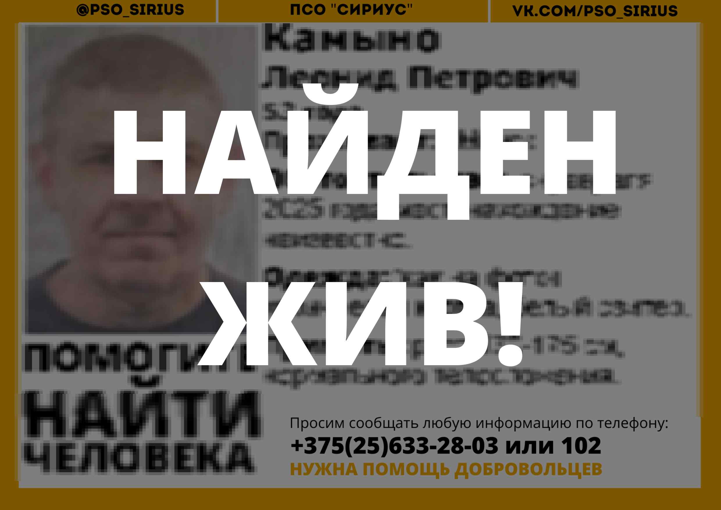 Всех, кто владеет информацией, просим сообщить: ПСО "Сириус" +375(25)633-28-03 |