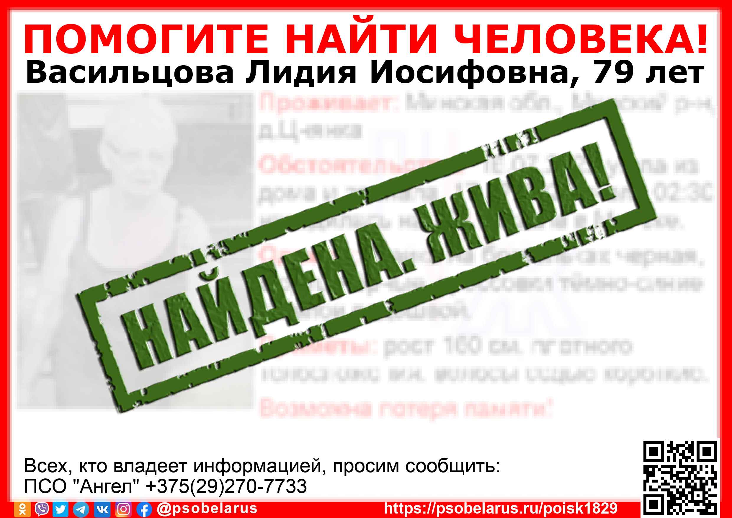 Всех, кто владеет информацией, просим сообщить: ПСО "Ангел" +375(29)270-7733 |