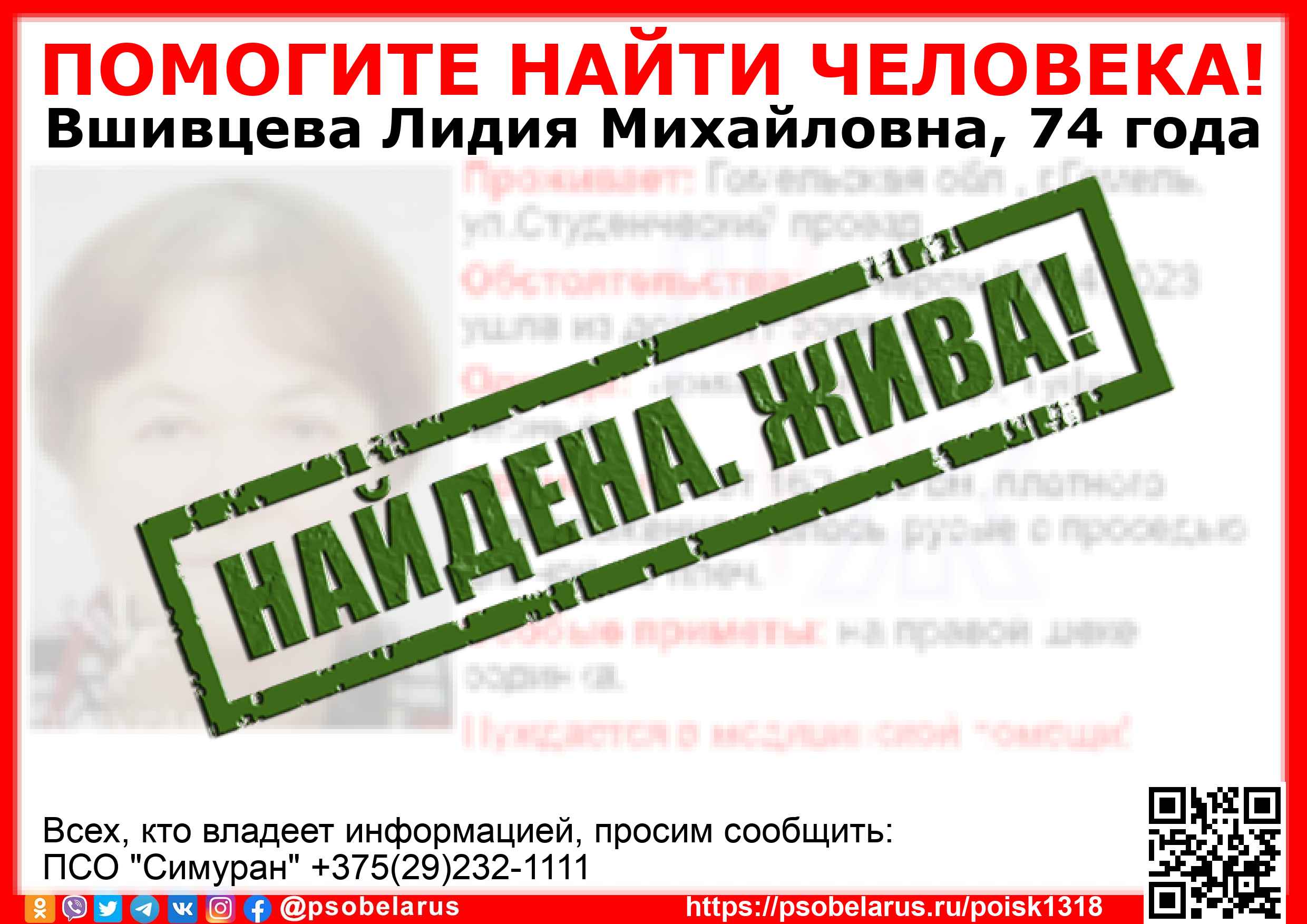 Всех, кто владеет информацией, просим сообщить: ПСО "Симуран" +375(29)232-1111 |