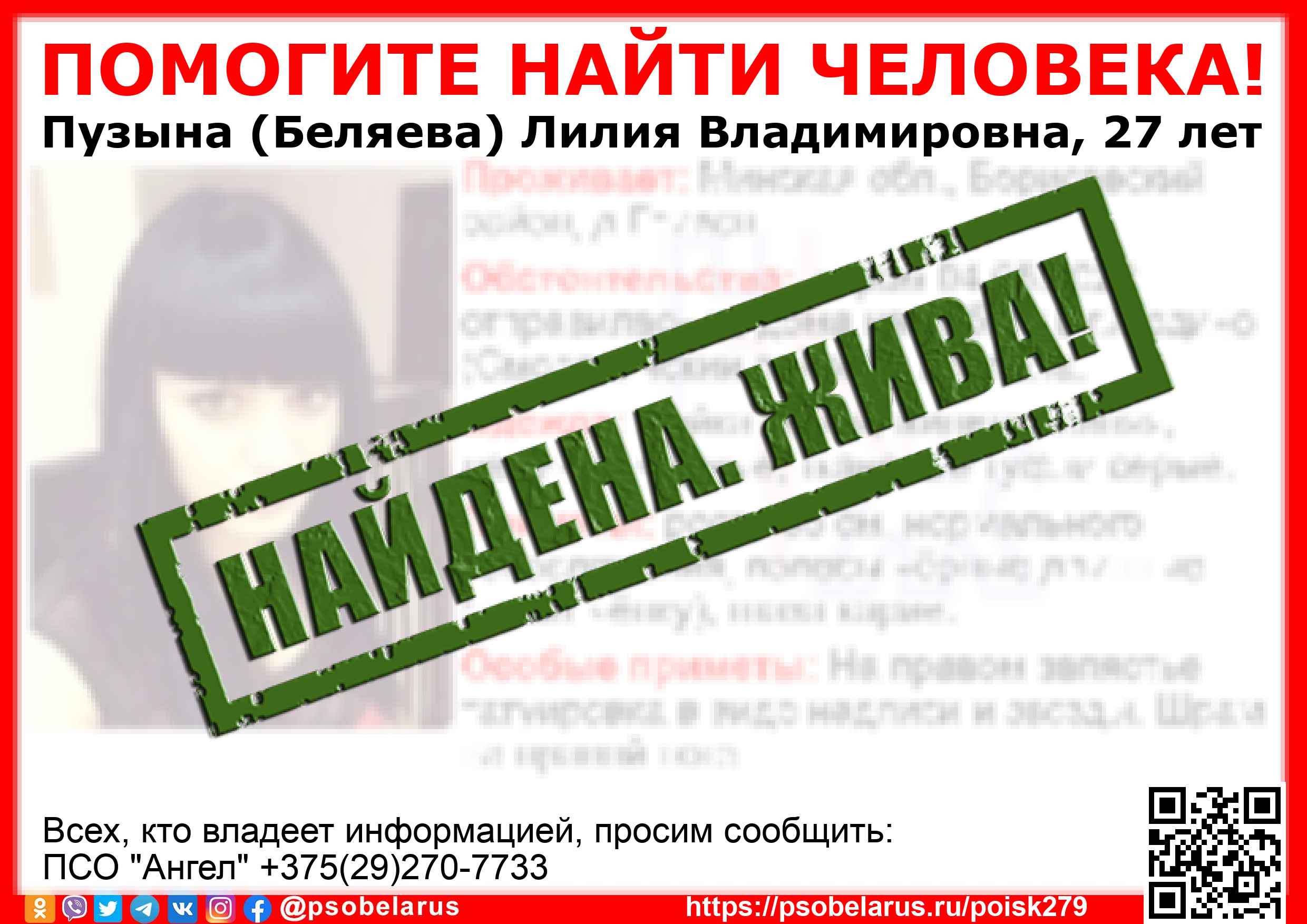 Всех, кто владеет информацией, просим сообщить: ПСО "Ангел" +375(29)270-7733 |