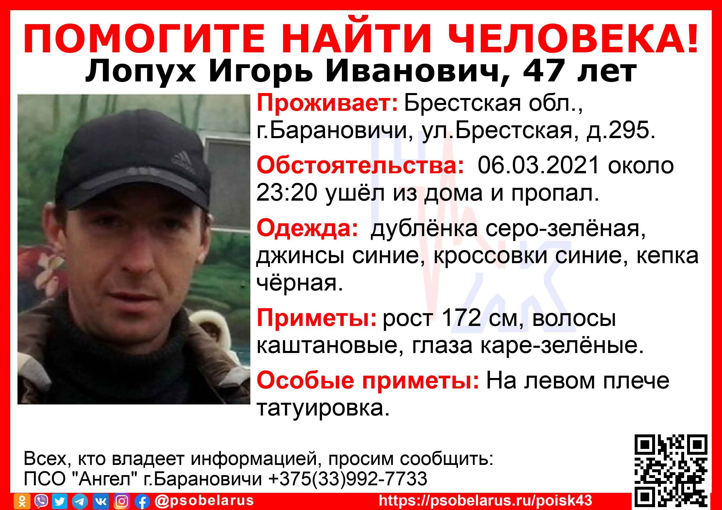Скачать ориентировкуДля оперативного получения информации о пропавших людях и сборах на поиски можно подписаться на бота оповещения: Телеграм