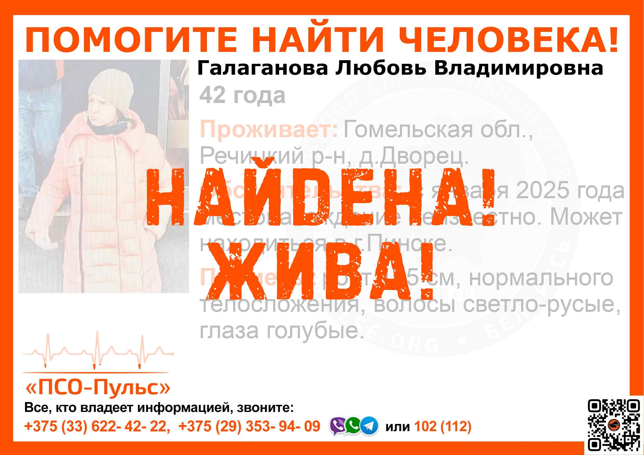 Всех, кто владеет информацией, просим сообщить: ПСО "ПСО-Пульс" +375(33)622-4222 |