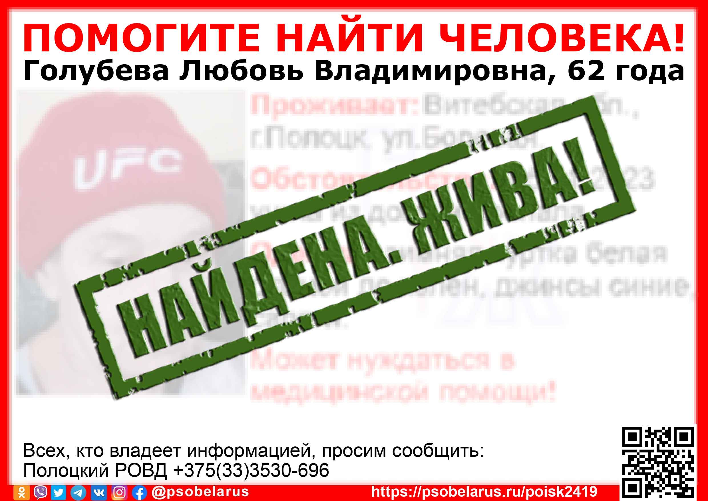 Скачать ориентировкуДля оперативного получения информации о пропавших людях и сборах на поиски можно подписаться на бота оповещения: Телеграм