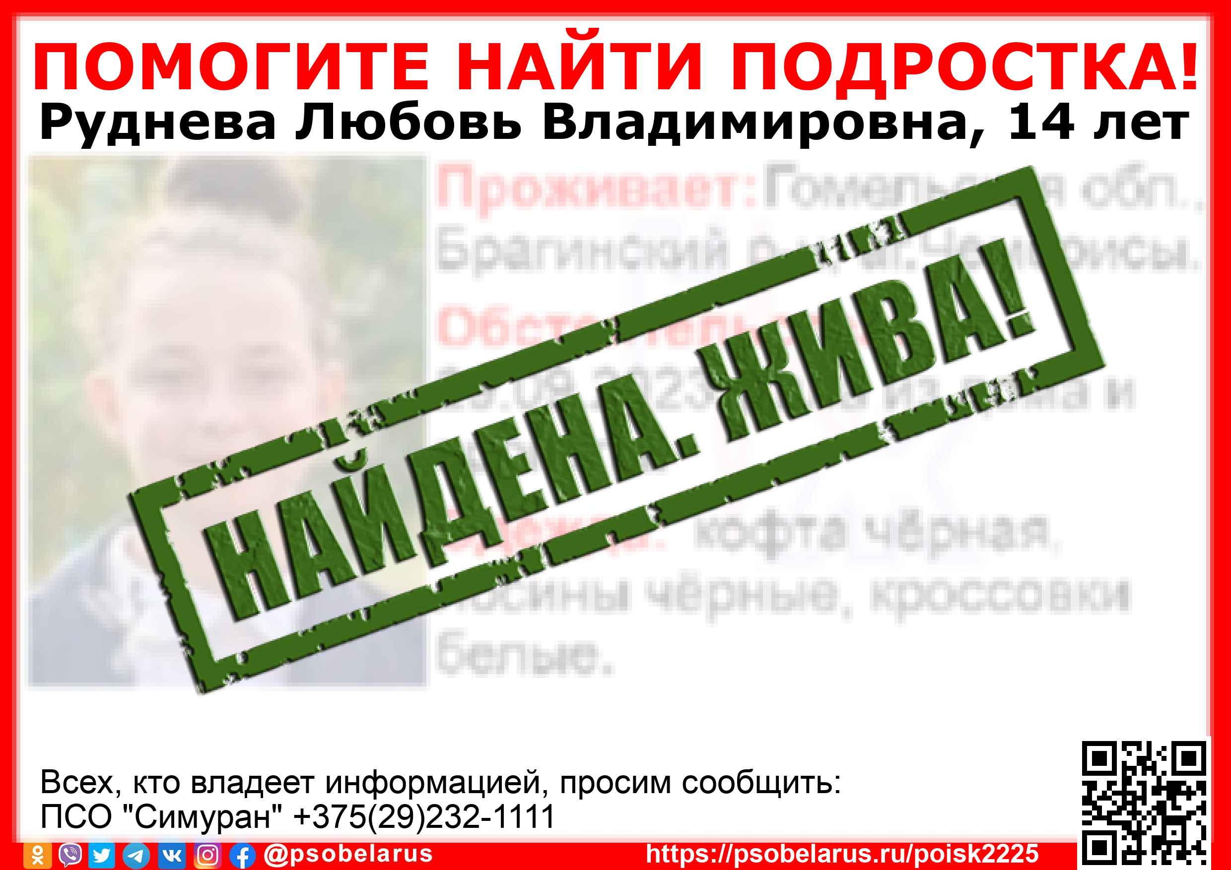 Всех, кто владеет информацией, просим сообщить: ПСО "Симуран" +375(29)232-1111 |