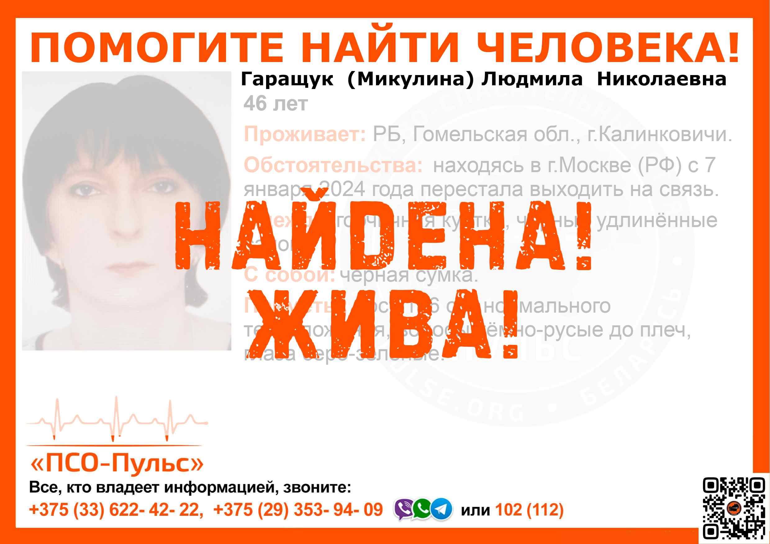 Всех, кто владеет информацией, просим сообщить: ПСО "ПСО-Пульс" +375(33)622-4222 |