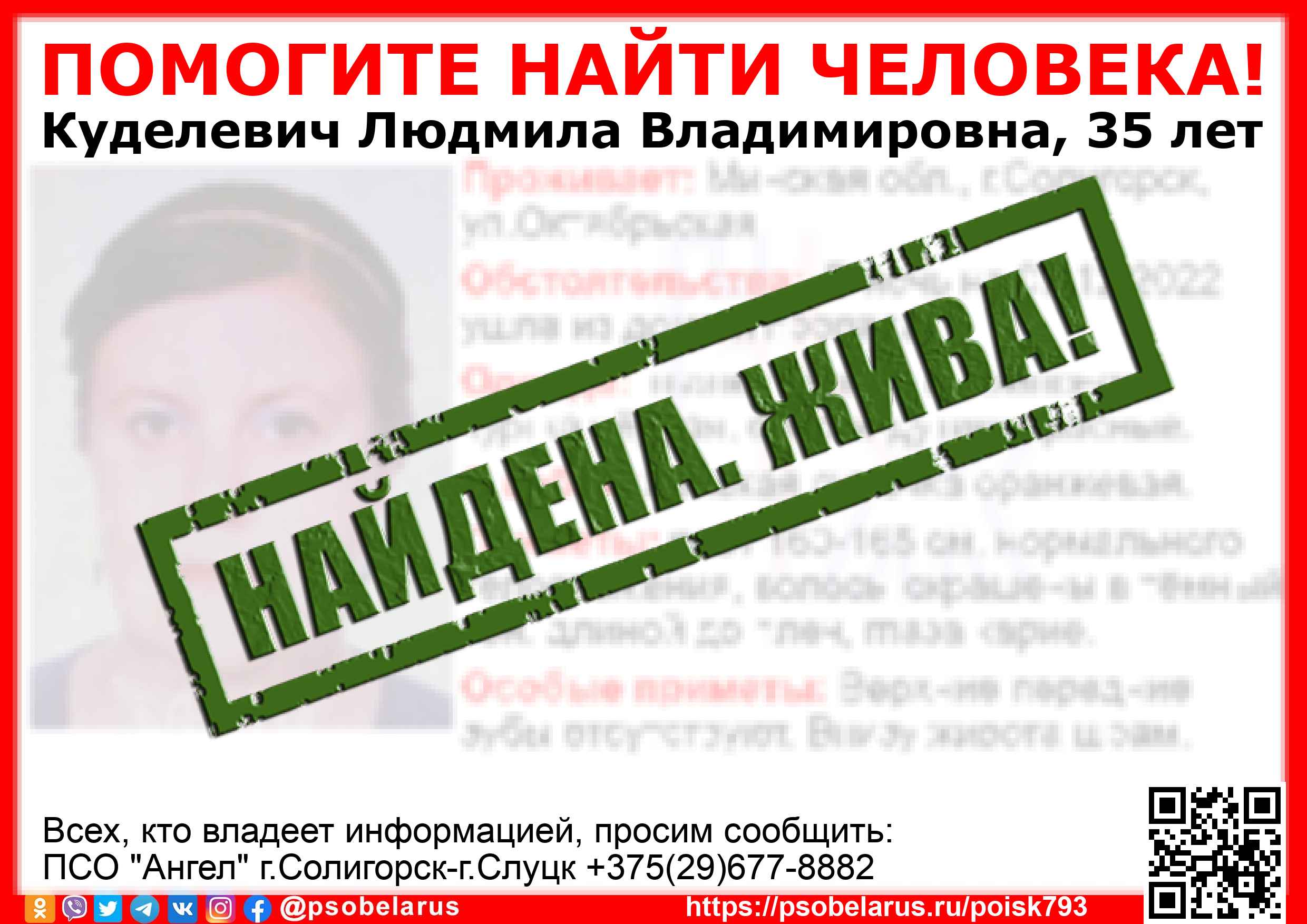 Всех, кто владеет информацией, просим сообщить: ПСО "Ангел" г.Солигорск-г.Слуцк +375(29)677-8882 |