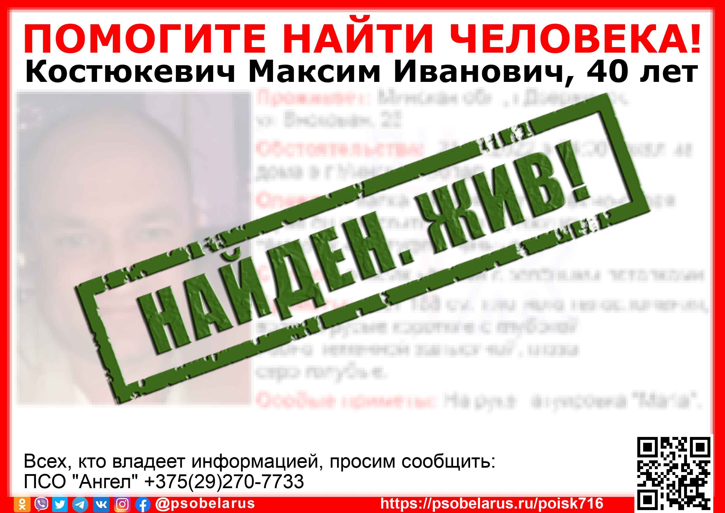 Всех, кто владеет информацией, просим сообщить: ПСО "Ангел" +375(29)270-7733 |