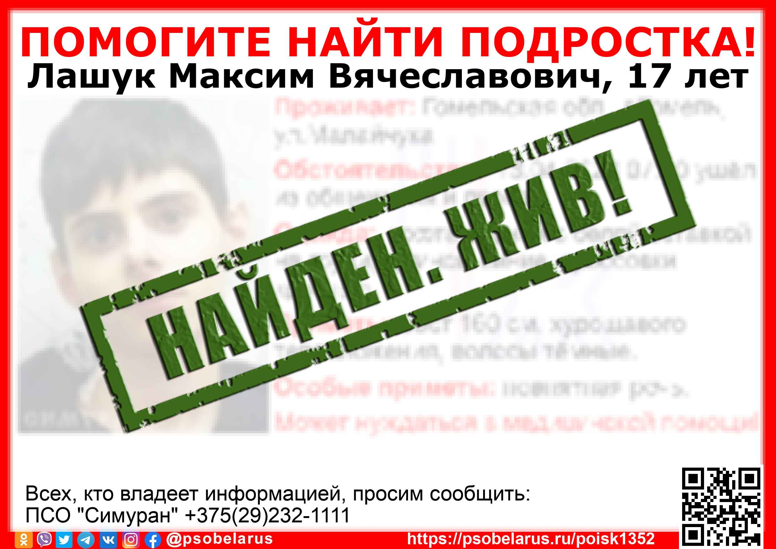 Всех, кто владеет информацией, просим сообщить: ПСО "Симуран" +375(29)232-1111 |
