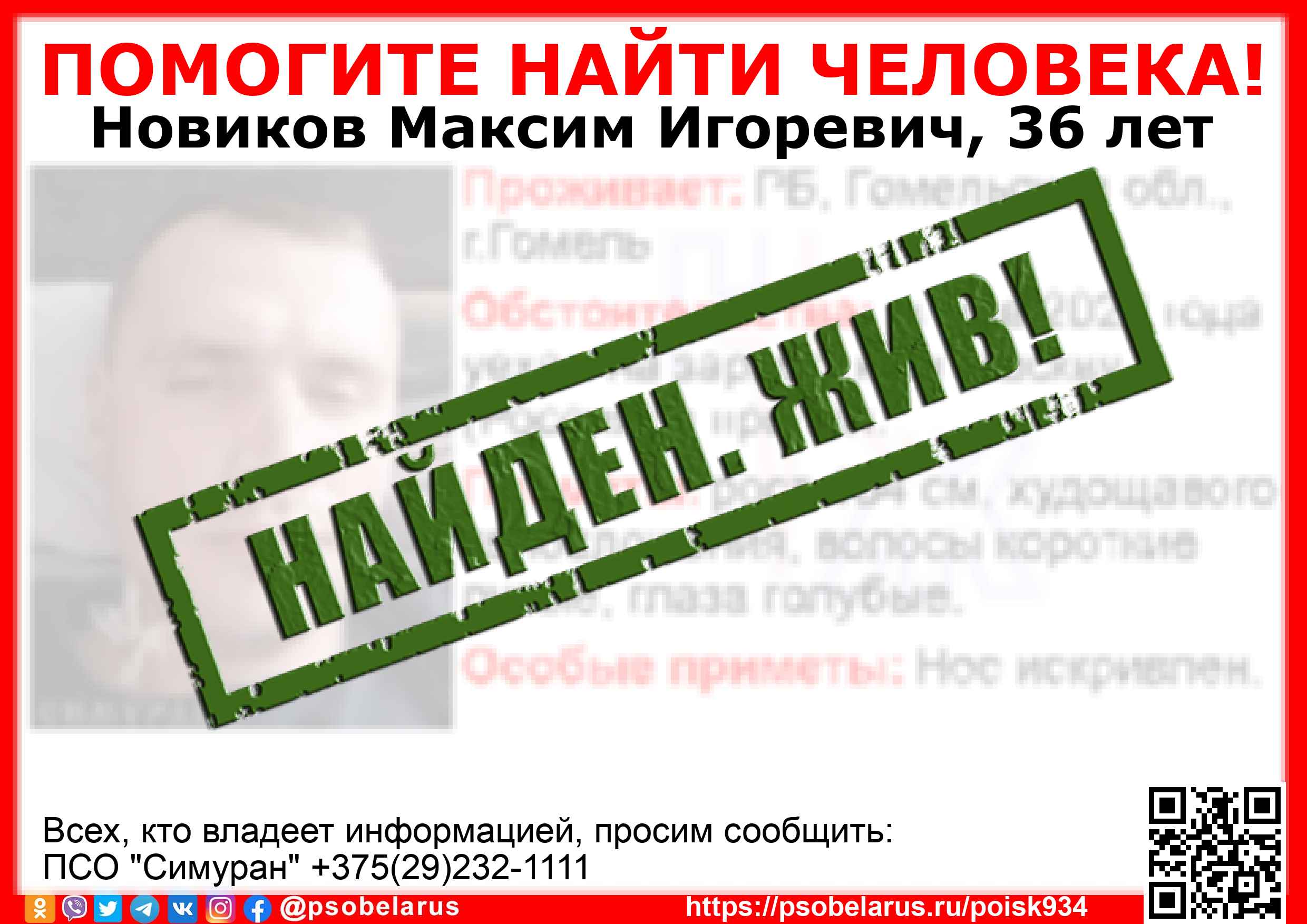 Всех, кто владеет информацией, просим сообщить: ПСО "Симуран" +375(29)232-1111 |