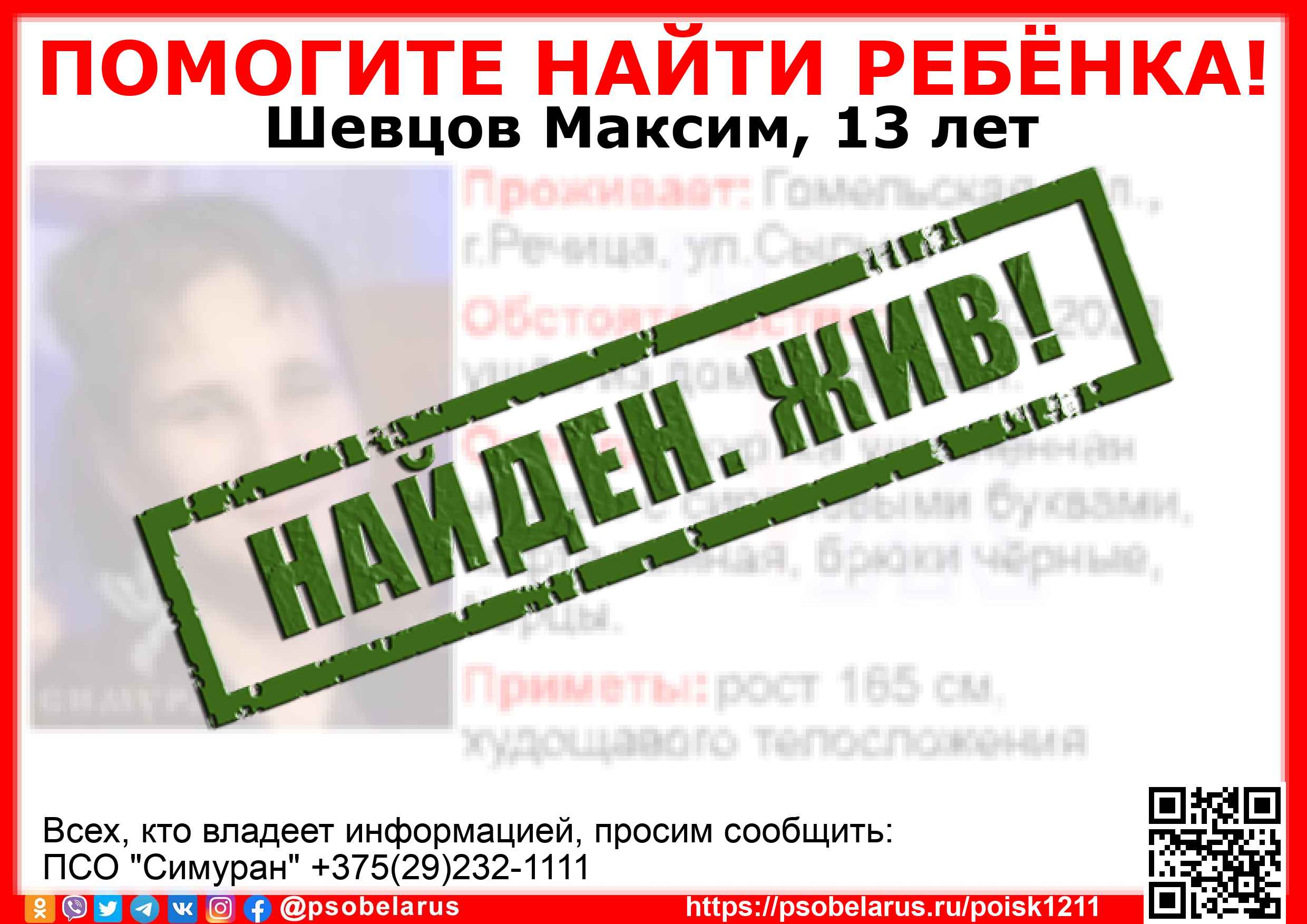 Всех, кто владеет информацией, просим сообщить: ПСО "Симуран" +375(29)232-1111 |