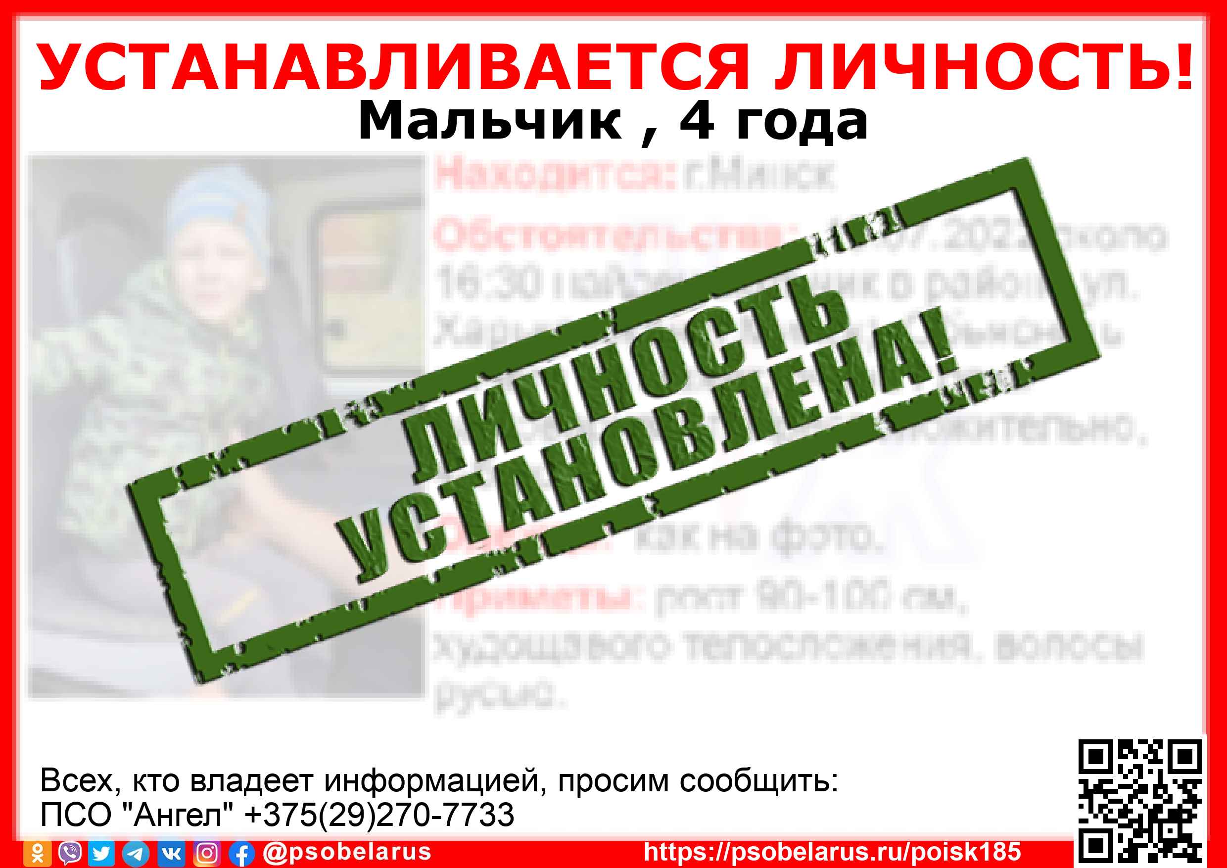 Всех, кто владеет информацией, просим сообщить: ПСО "Ангел" +375(29)270-7733 |
