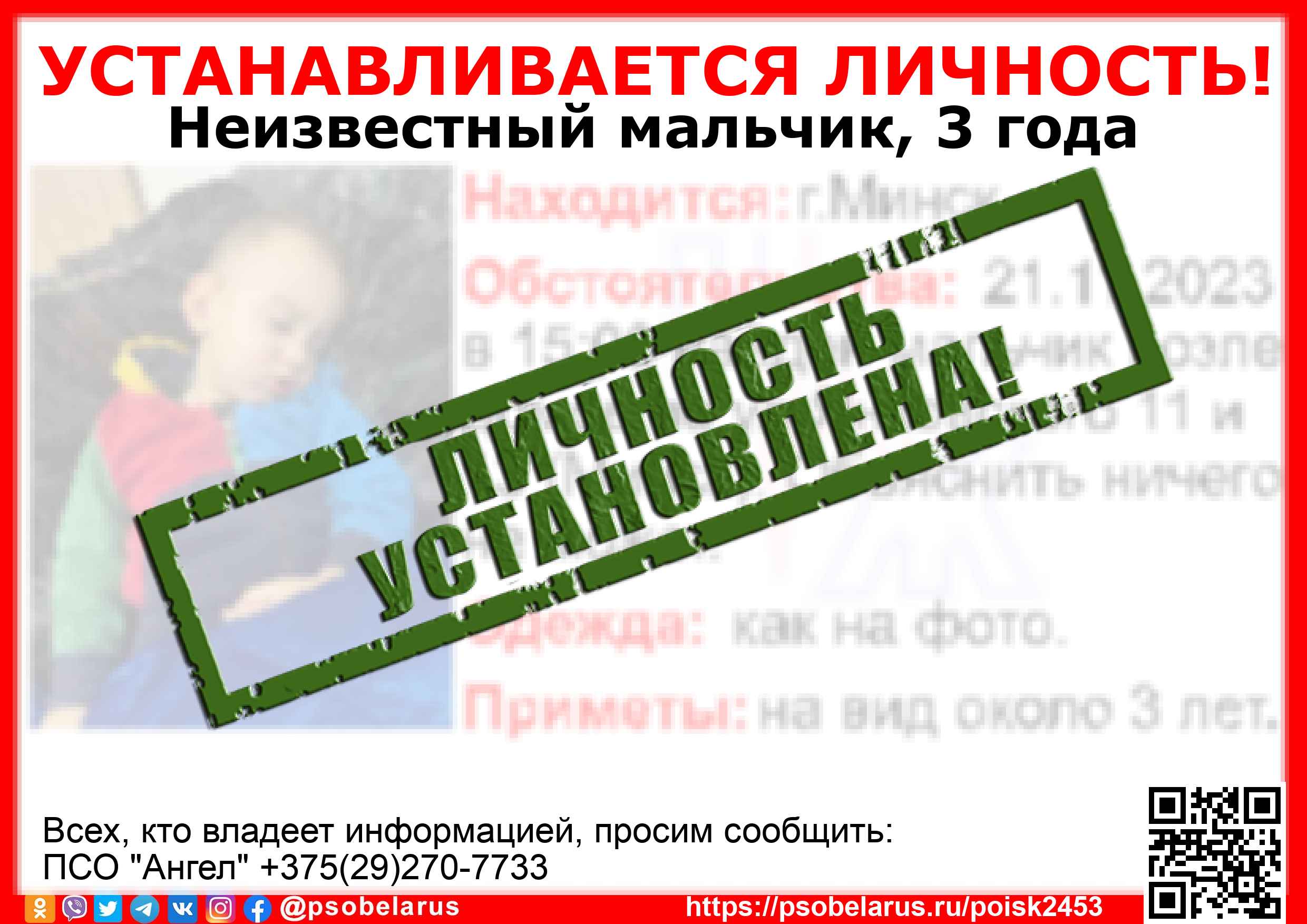 Всех, кто владеет информацией, просим сообщить: ПСО "Ангел" +375(29)270-7733 |