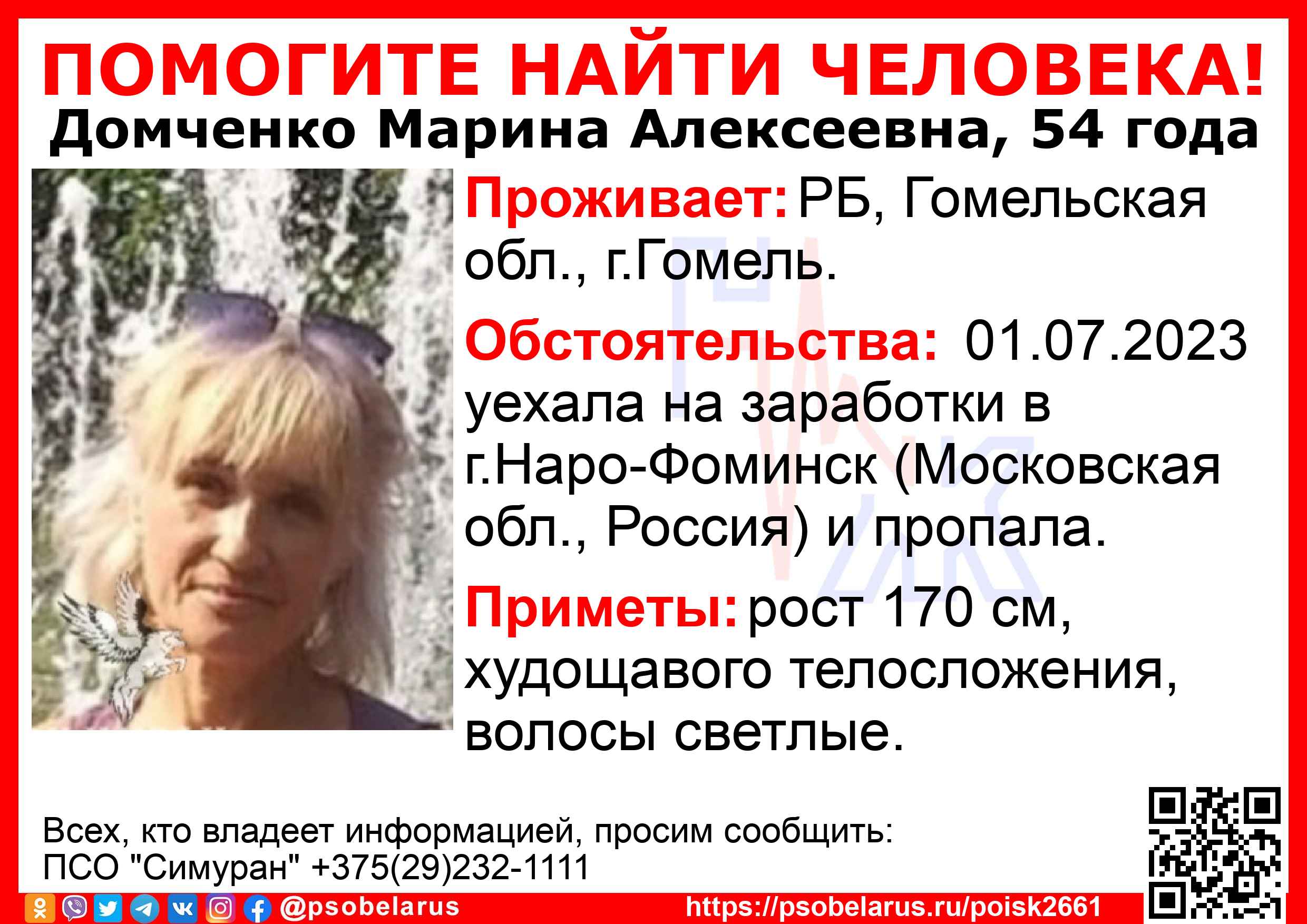 Скачать ориентировкуДля оперативного получения информации о пропавших людях и сборах на поиски можно подписаться на бота оповещения: Телеграм