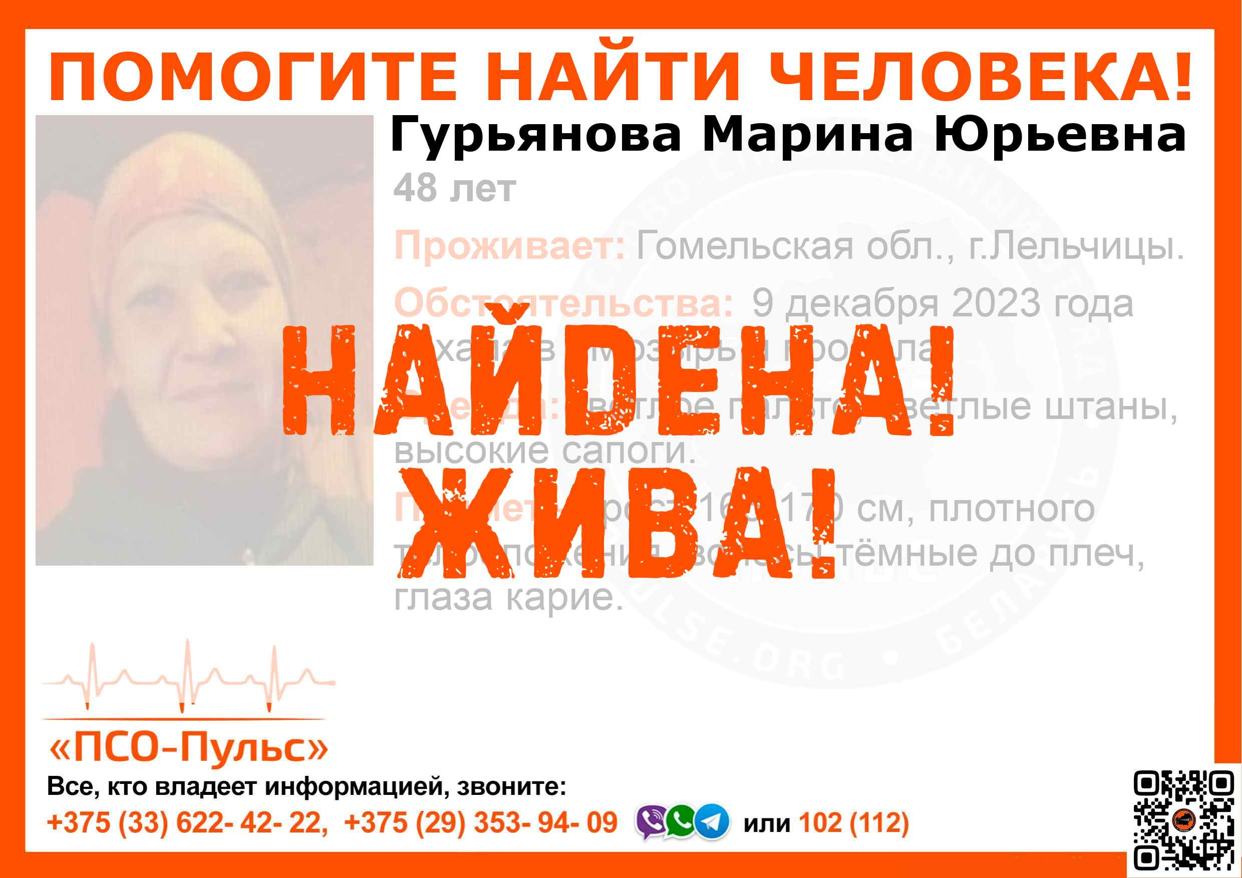 Скачать ориентировкуДля оперативного получения информации о пропавших людях и сборах на поиски можно подписаться на бота оповещения: Телеграм