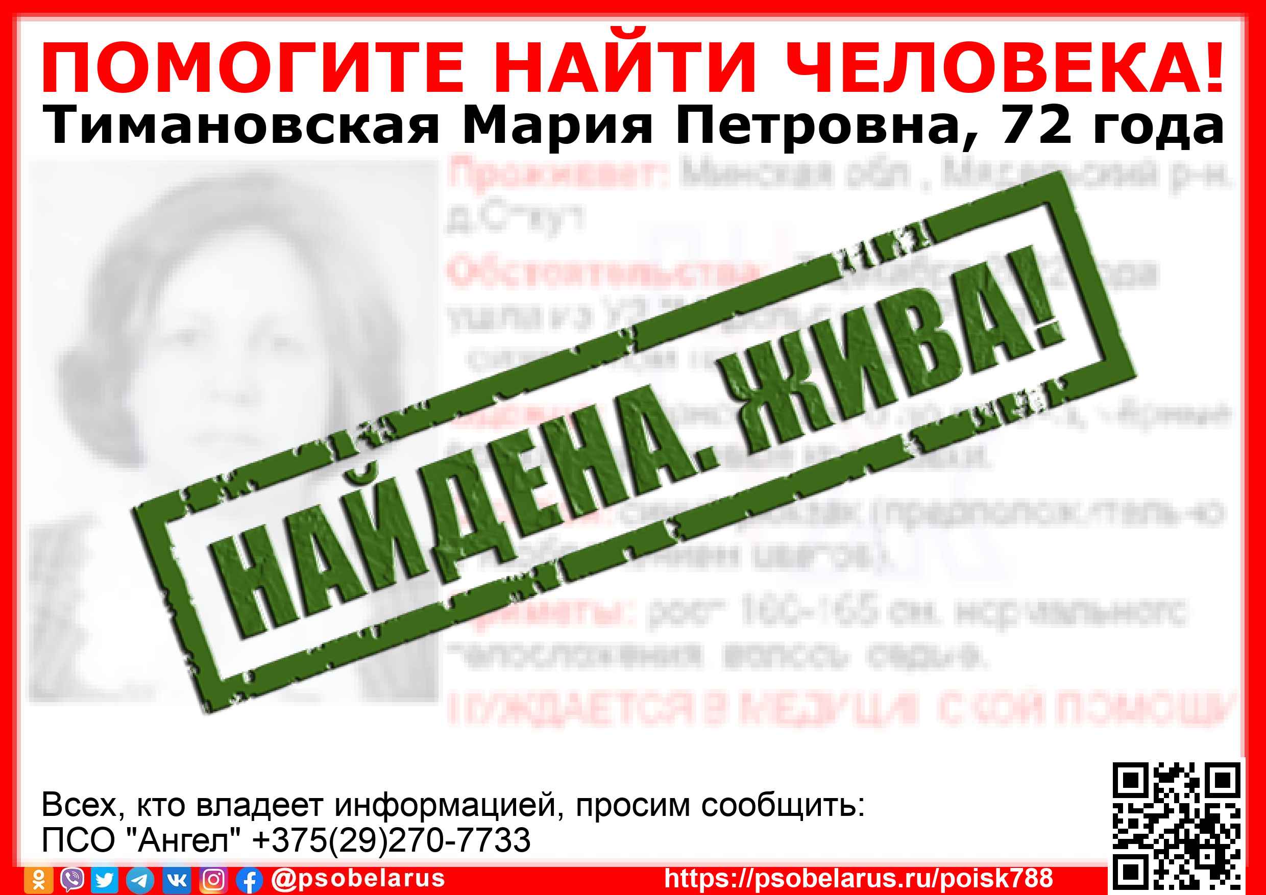 Всех, кто владеет информацией, просим сообщить: ПСО "Ангел" +375(29)270-7733 |