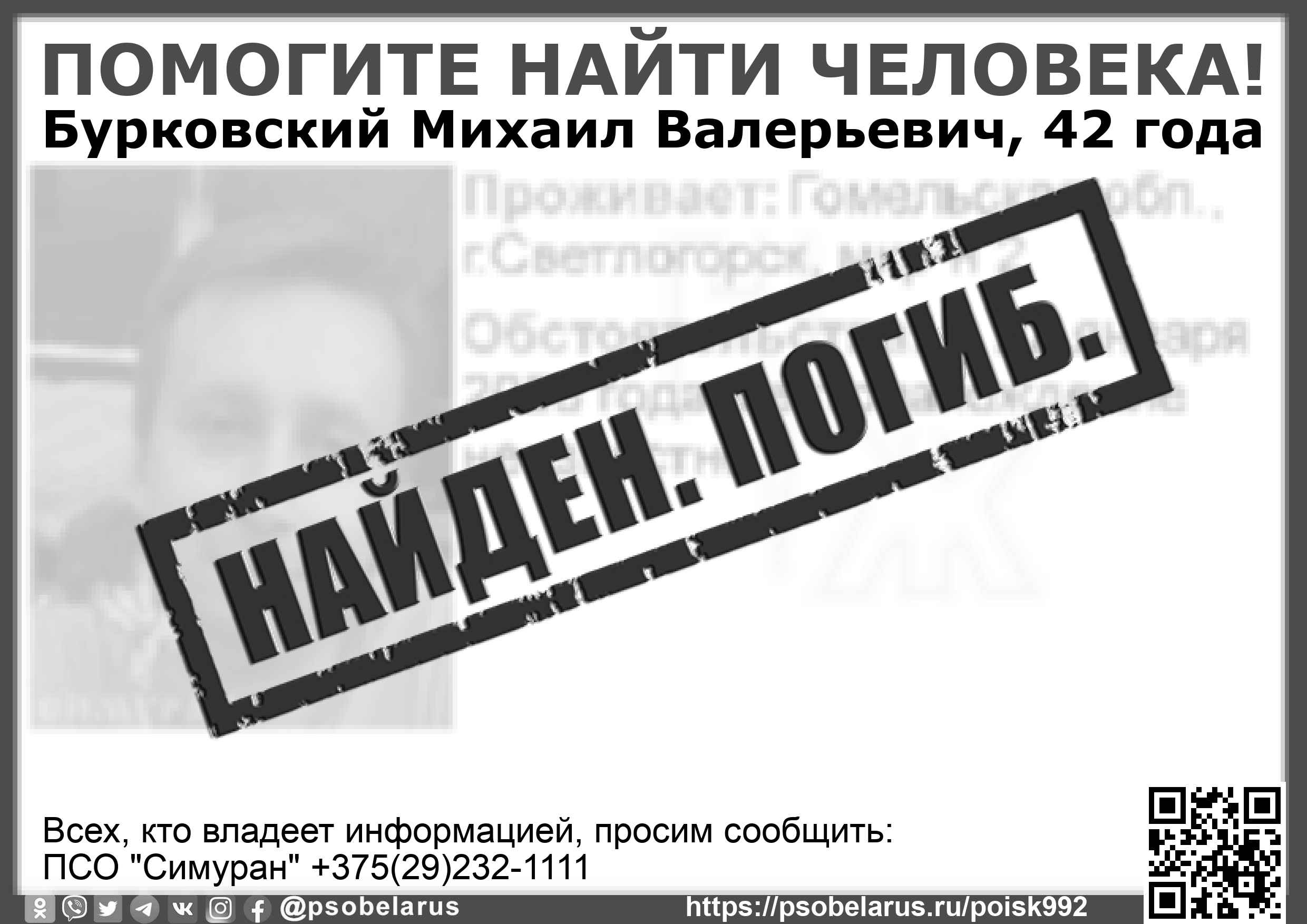 Всех, кто владеет информацией, просим сообщить: ПСО "Симуран" +375(29)232-1111  |