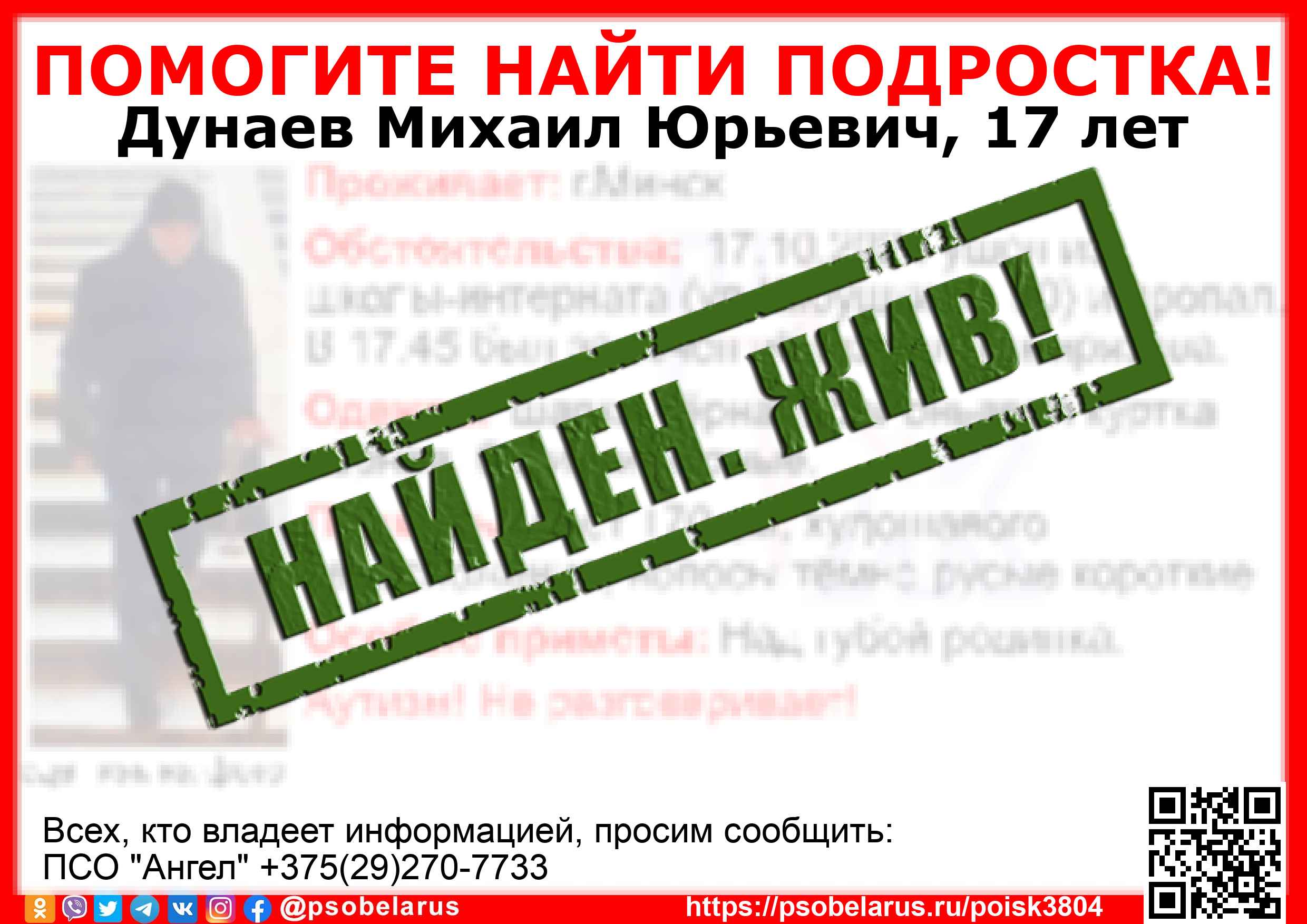 Всех, кто владеет информацией, просим сообщить: ПСО "Ангел" +375(29)270-7733 |