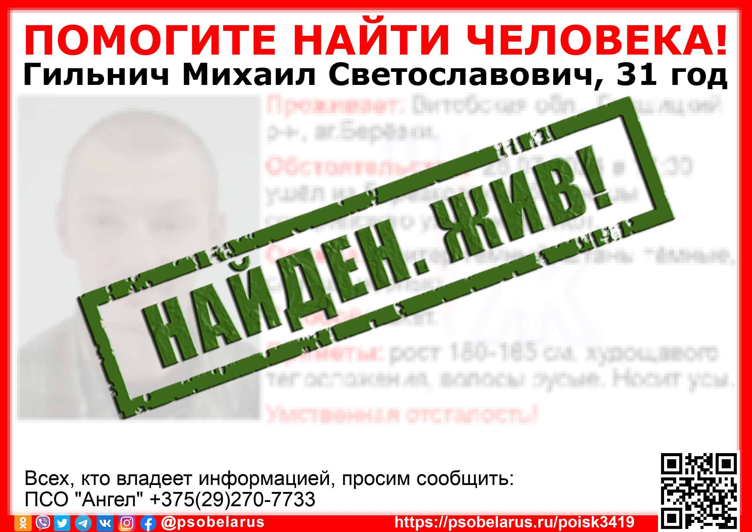 Всех, кто владеет информацией, просим сообщить: ПСО "Ангел" +375(29)270-7733  |