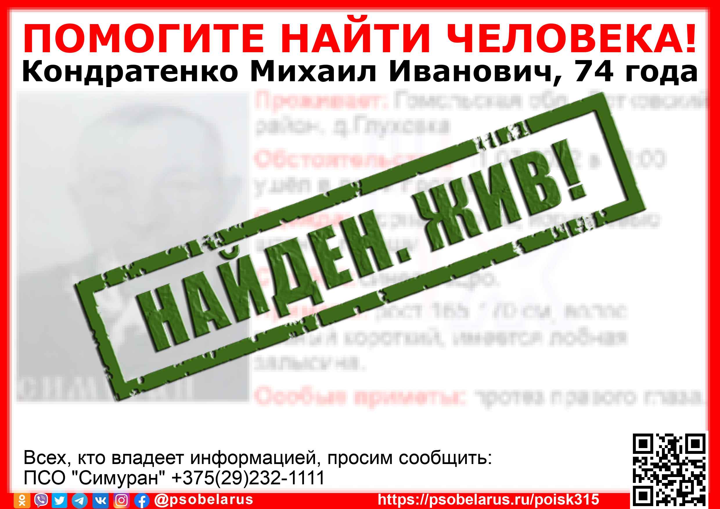Всех, кто владеет информацией, просим сообщить: ПСО "Симуран" +375(29)232-1111 |