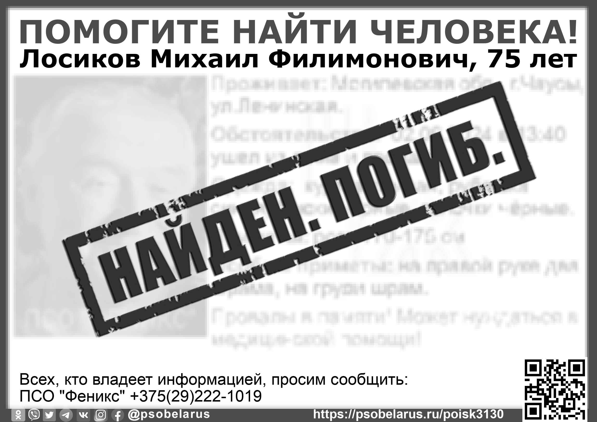Всех, кто владеет информацией, просим сообщить: ПСО "Феникс" +375(29)222-1019 |