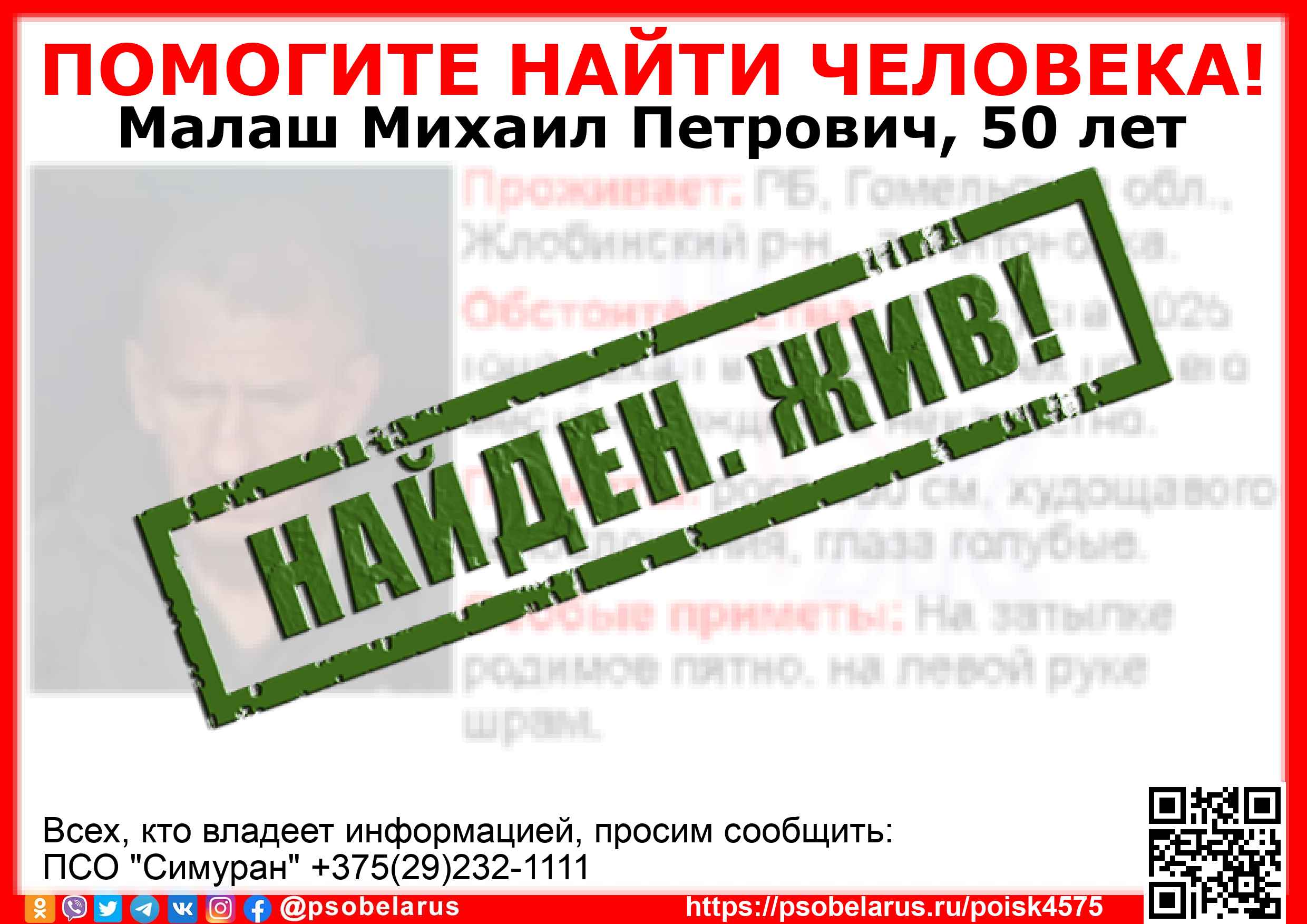 Всех, кто владеет информацией, просим сообщить: ПСО "Симуран" +375(29)232-1111 |