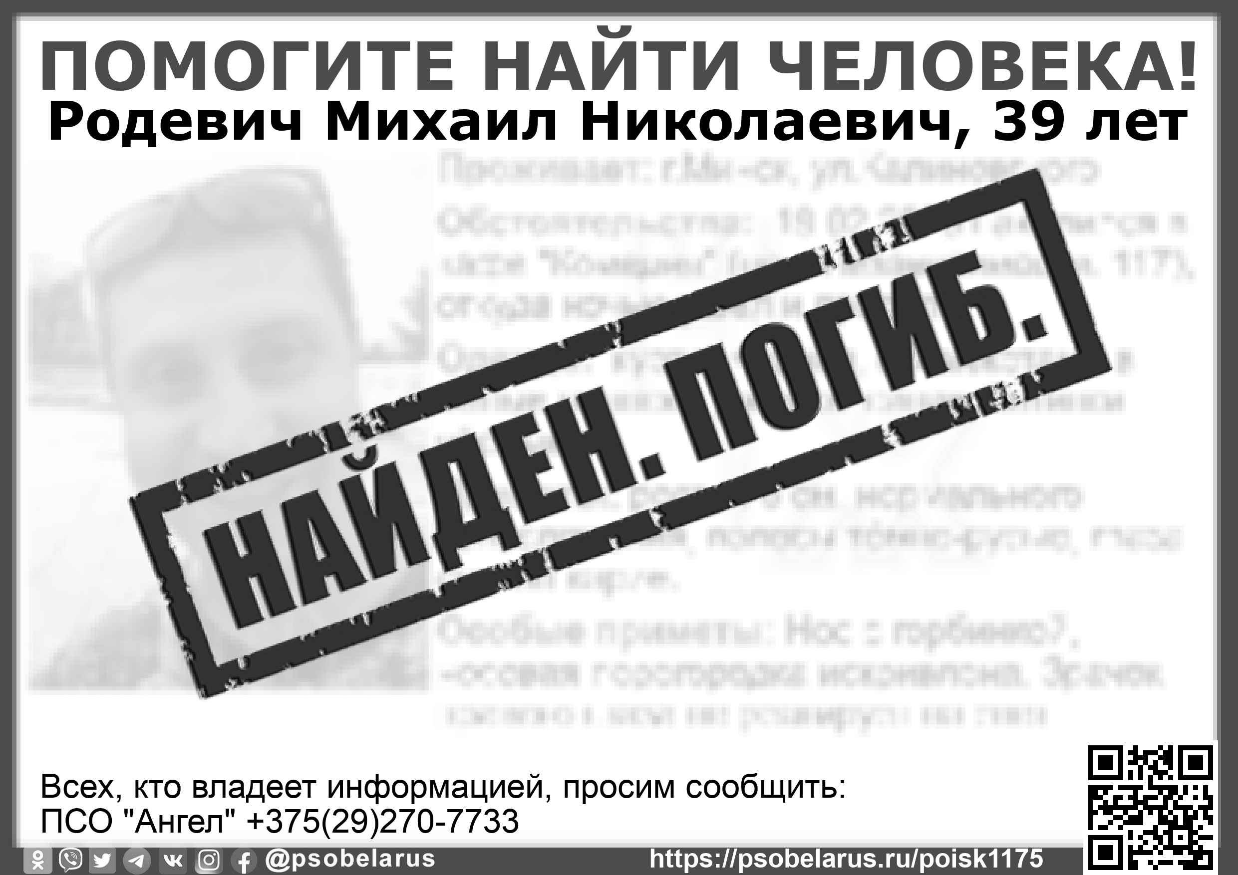 Всех, кто владеет информацией, просим сообщить: ПСО "Ангел" +375(29)270-7733 |