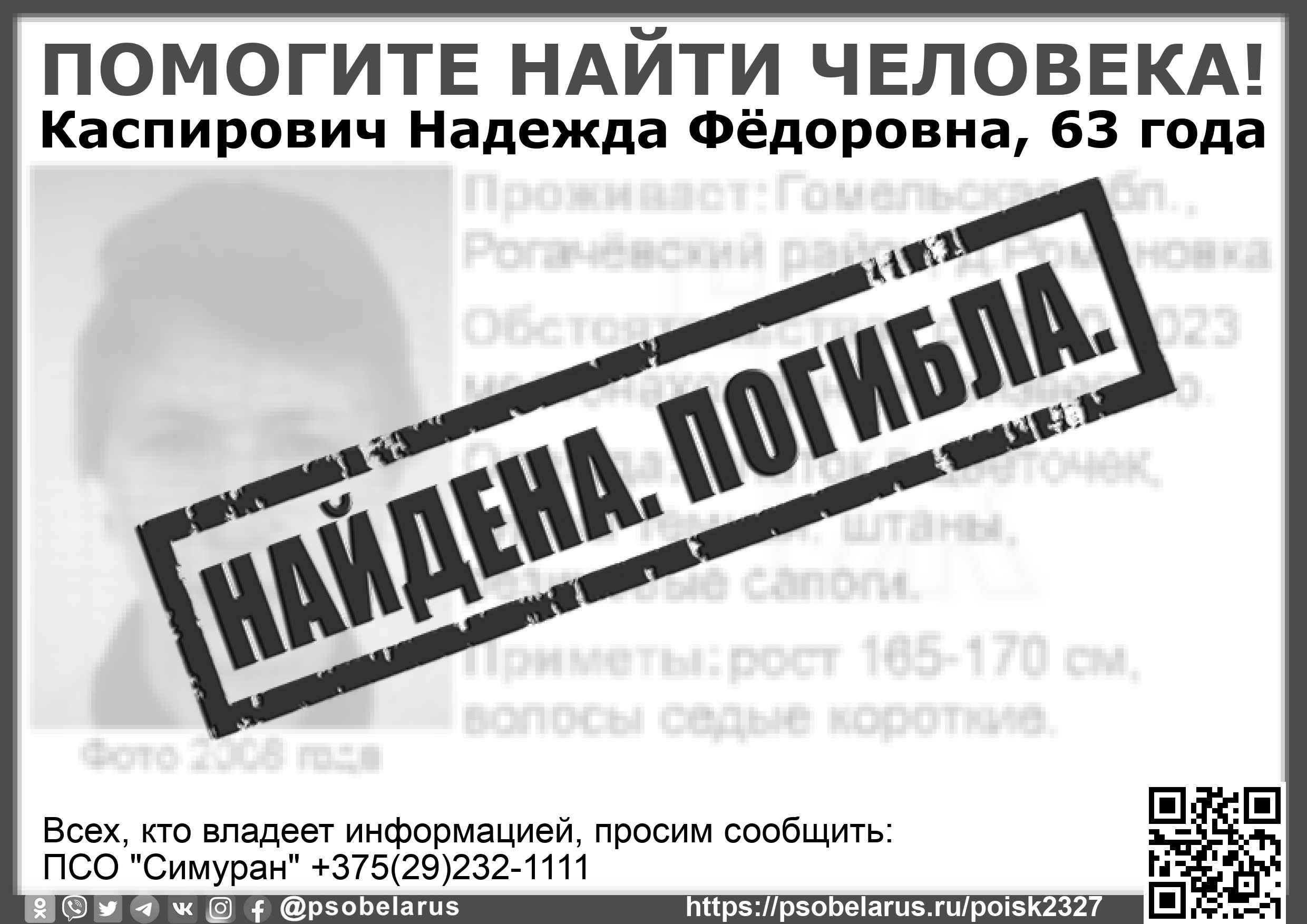 Всех, кто владеет информацией, просим сообщить: ПСО "Симуран" +375(29)232-1111 |