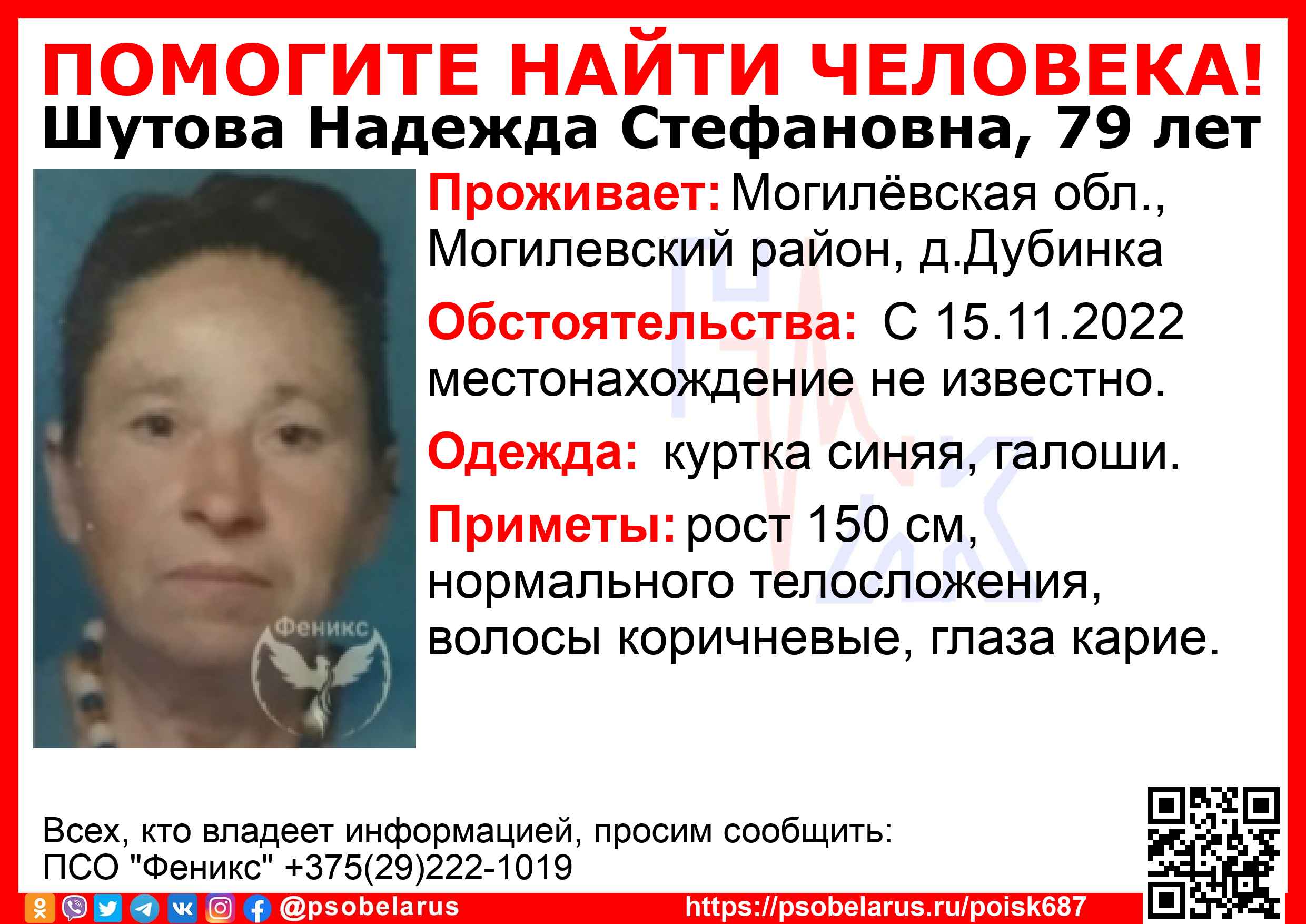 Скачать ориентировкуДля оперативного получения информации о пропавших людях и сборах на поиски можно подписаться на бота оповещения: Телеграм