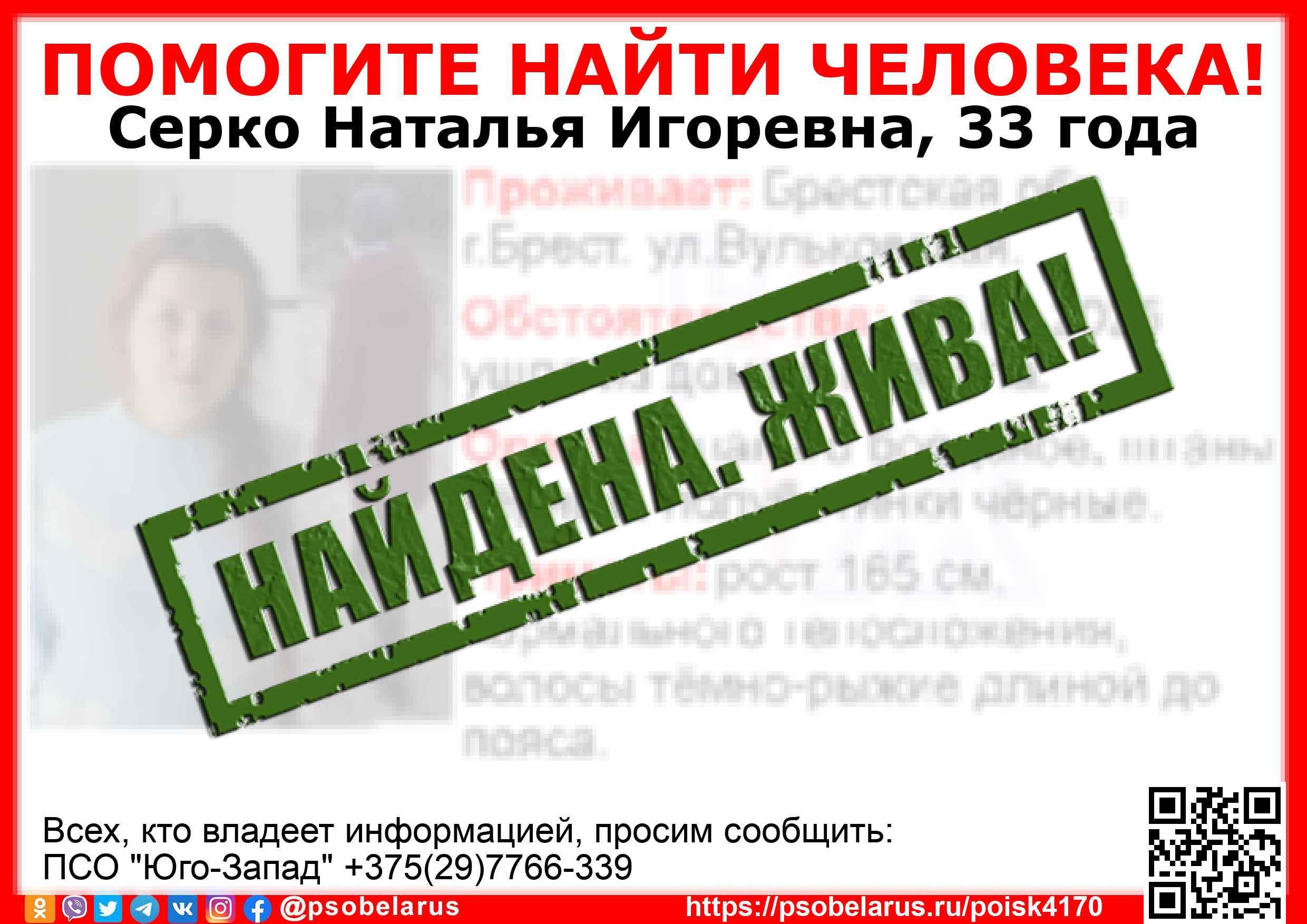 Всех, кто владеет информацией, просим сообщить: ПСО "Юго-Запад" +375(29)7766-339 |