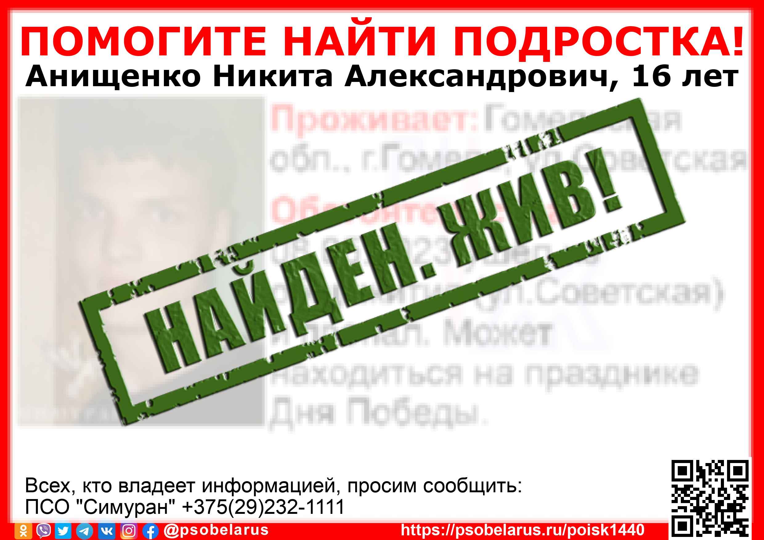 Всех, кто владеет информацией, просим сообщить: ПСО "Симуран" +375(29)232-1111 |