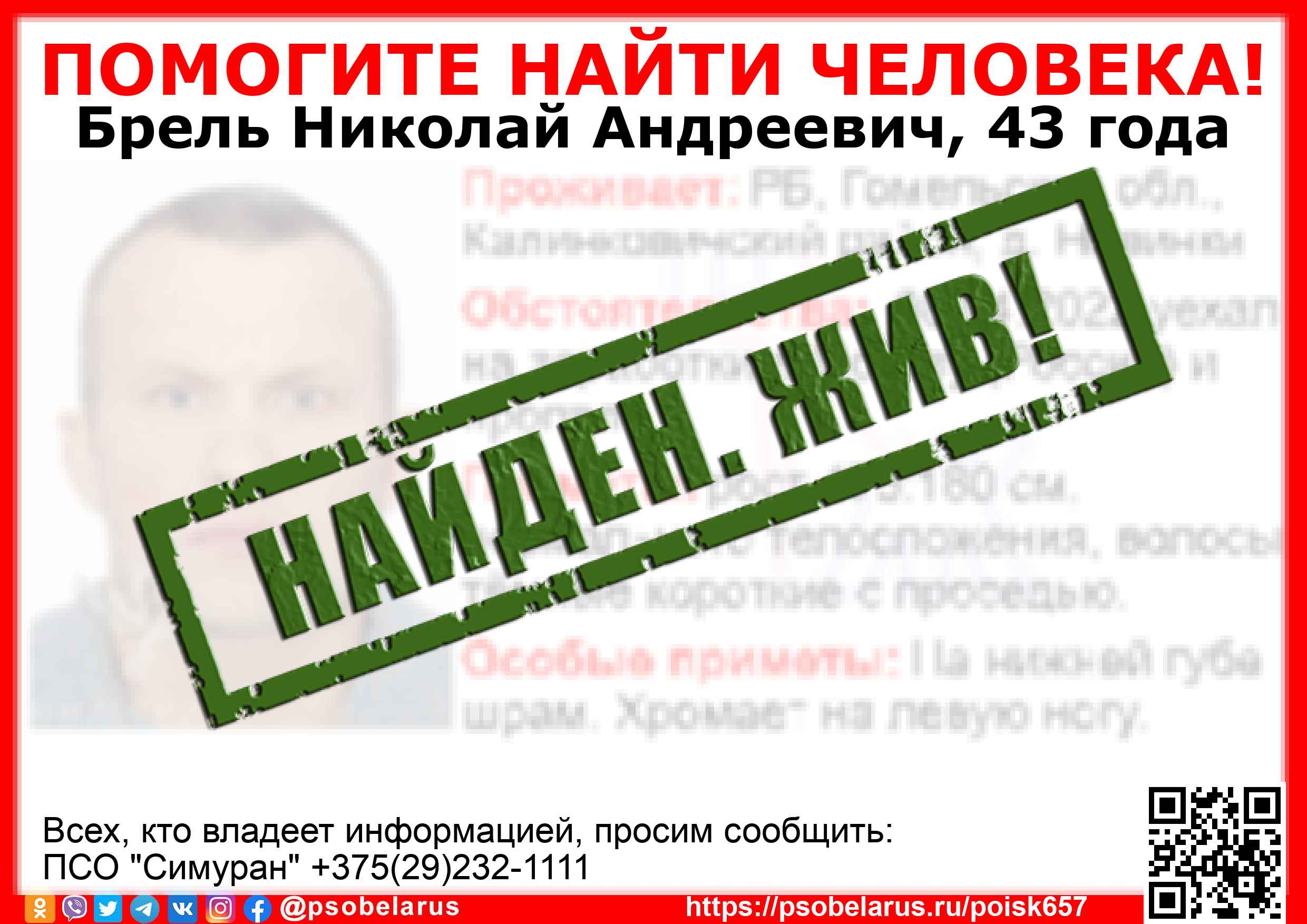 Всех, кто владеет информацией, просим сообщить: ПСО "Симуран" +375(29)232-1111 |