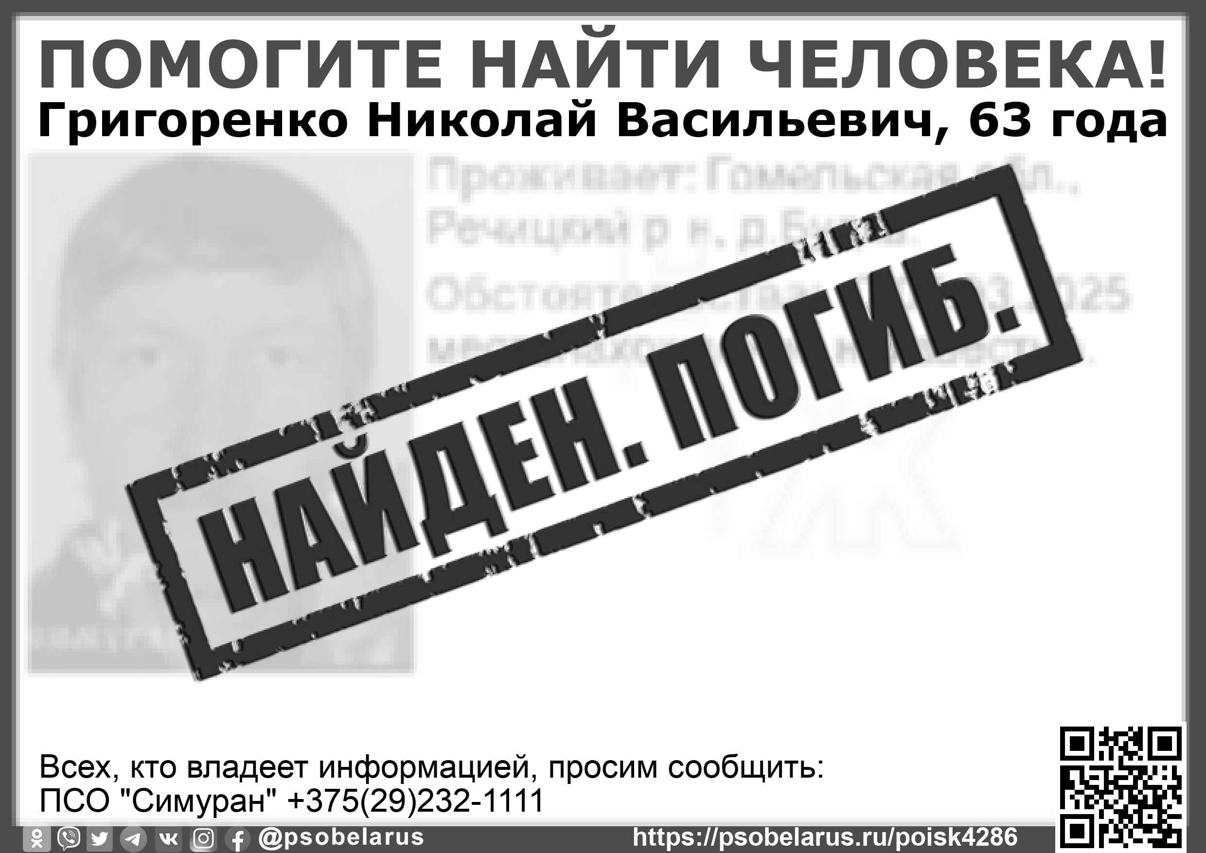 Всех, кто владеет информацией, просим сообщить: ПСО "Симуран" +375(29)232-1111 |