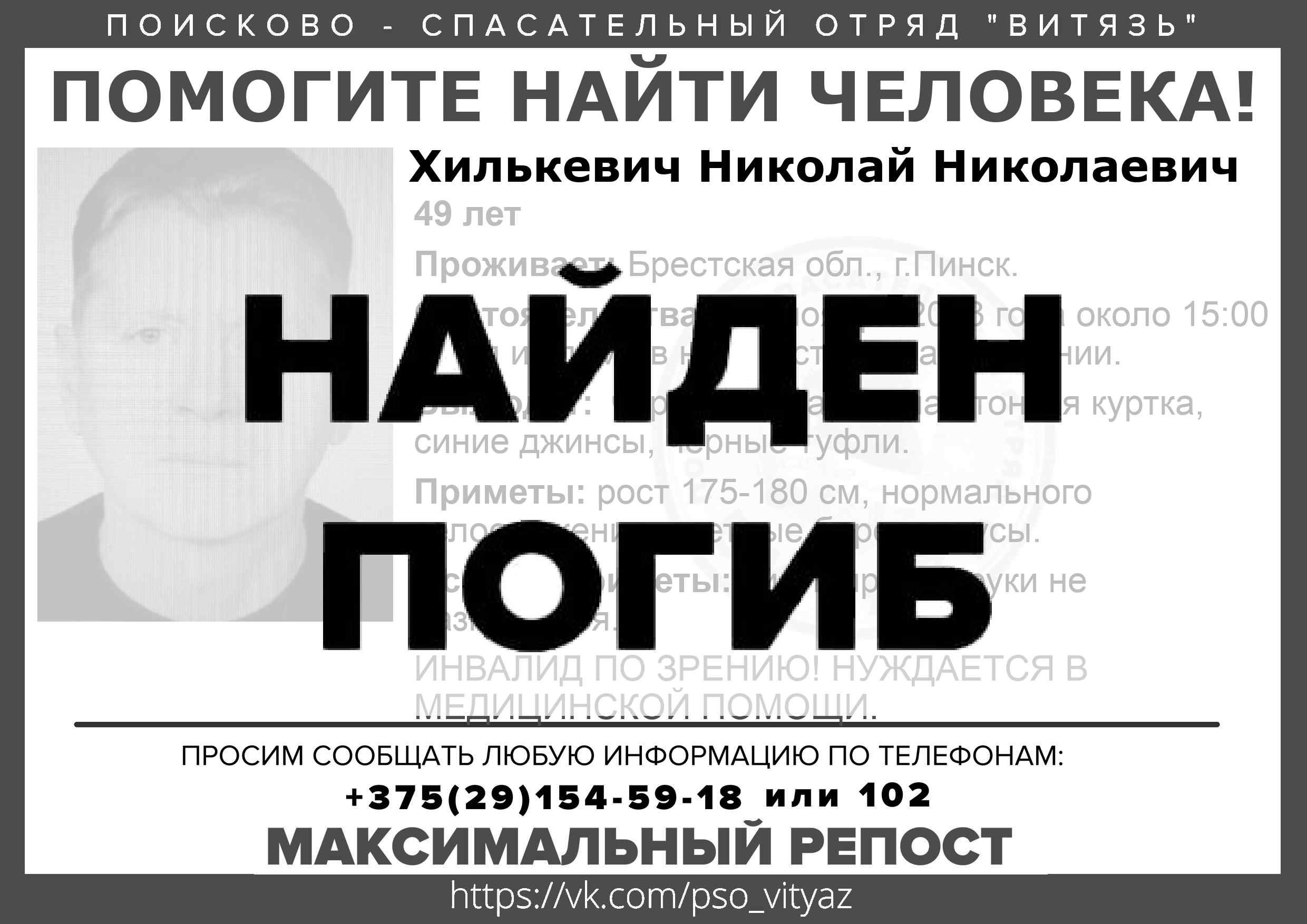 Всех, кто владеет информацией, просим сообщить: ПСО "ВИТЯЗЬ" +375(29)154-59-18 |