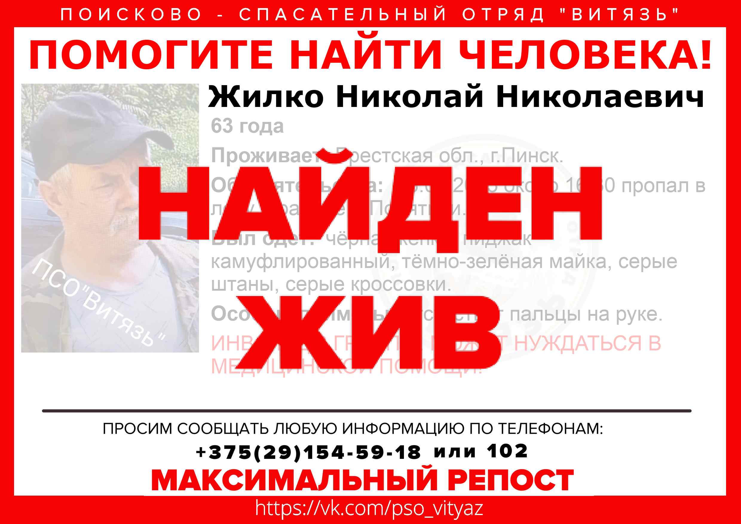 Всех, кто владеет информацией, просим сообщить: ПСО "ВИТЯЗЬ" +375(29)154-59-18 |