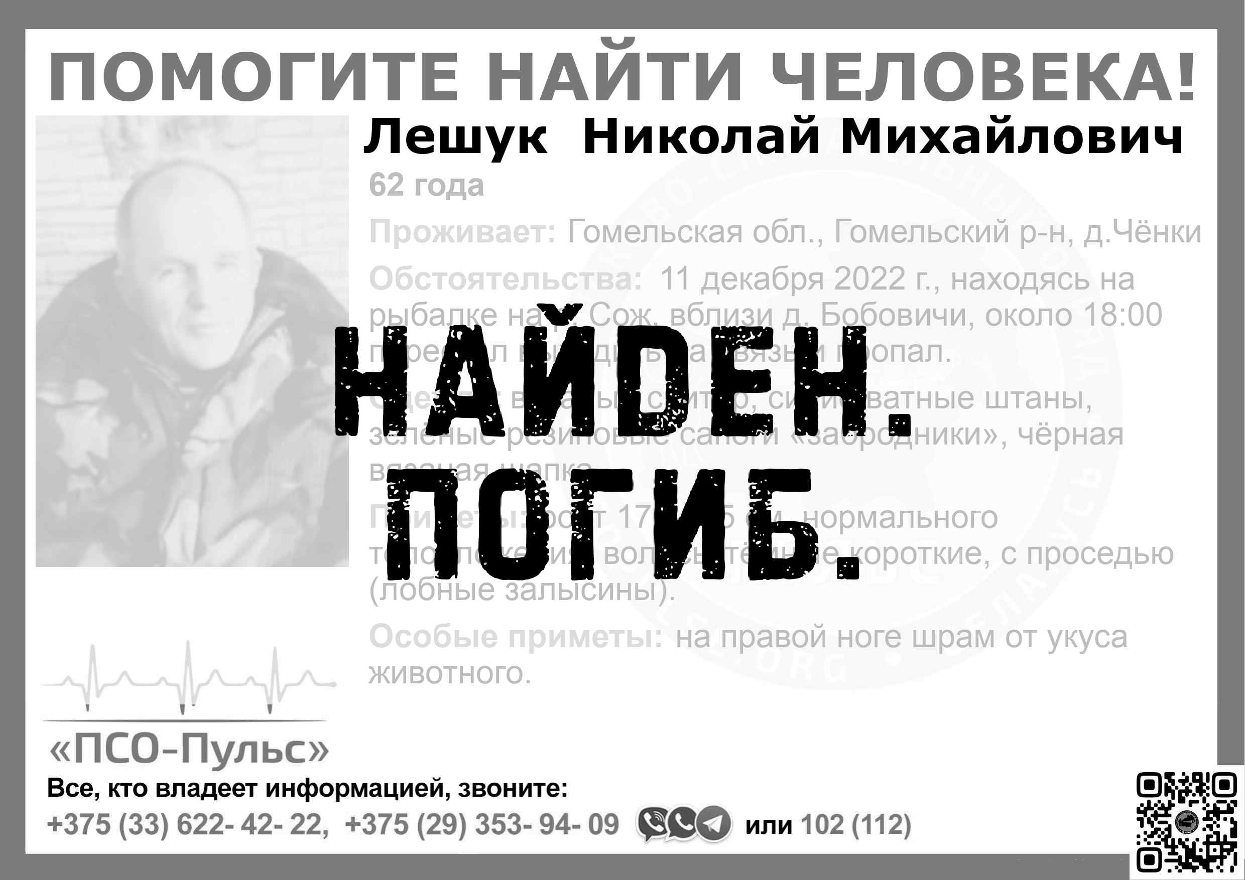 Всех, кто владеет информацией, просим сообщить: ПСО "ПСО-Пульс" +375(33)622-4222 |