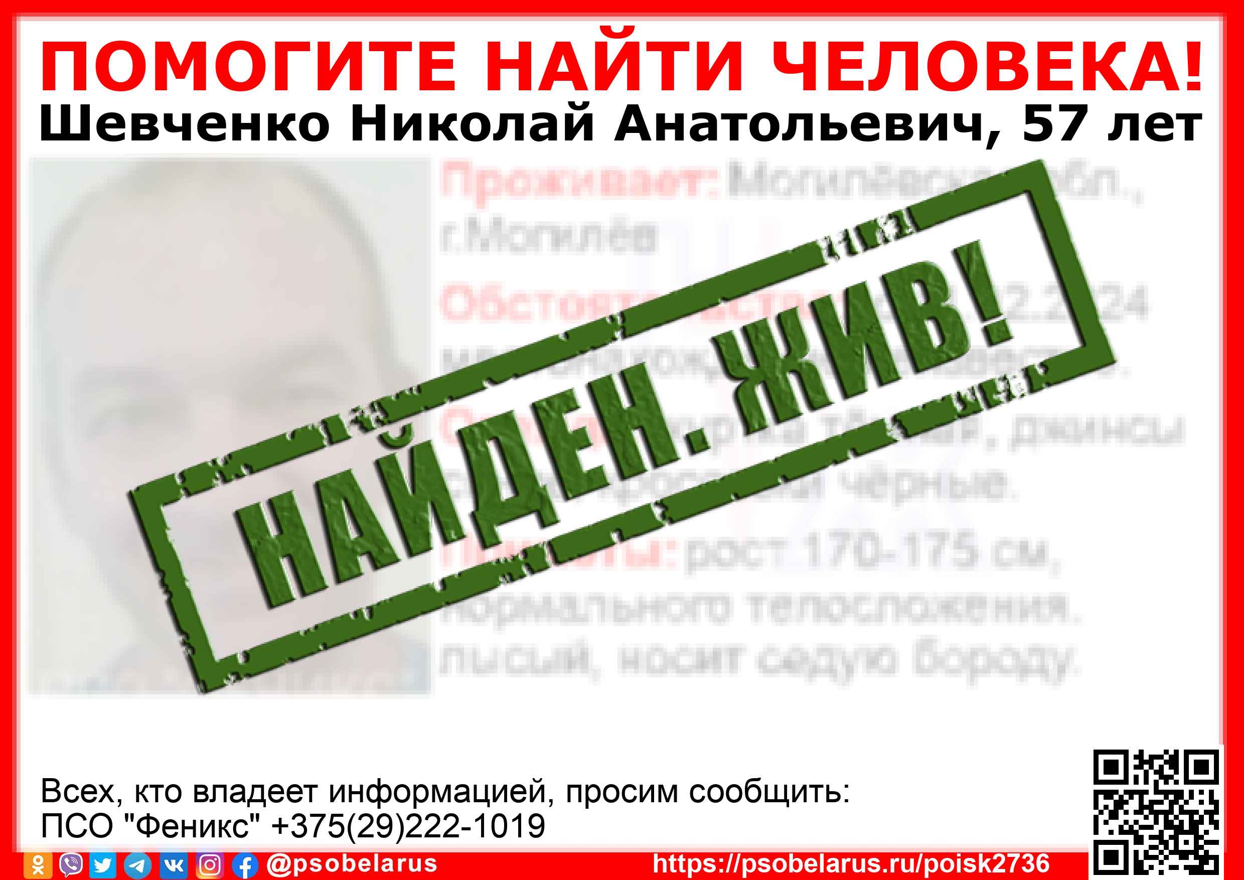 Всех, кто владеет информацией, просим сообщить: ПСО "Феникс" +375(29)222-1019 |